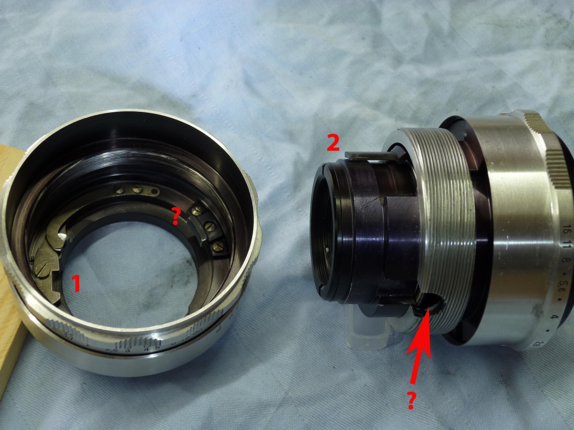 Einen Anhaltspunkt gebe ich Dir mal... Wenn sich die Teile Objektivbaugruppengewinde und Fokussierkörper trennen, so geschieht dies, weil das Objektiv so weit in den Nahbereich ausgefahren war, das dieser Stummel aus dem Schlitz im Objektivgewinde heraus kam... .also die Begrenzungsschraube wurde entfernt und beim Drehen des Fokusringes trennten sich die Teile dann an der untersten Naheinstellgrenze der Indexmarkierung, weil Du ohne Begrenzer das Herausgleiten des Stummels nicht mehr verhinderst.