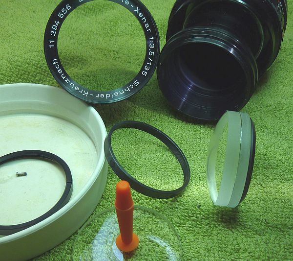 Die Frontlinse wird von einem Schraubring gehalten, der lässt sich nach entfernen der 4 seitlichen Schrauben am vorderen Gehäuseteil leicht lösen lässt.