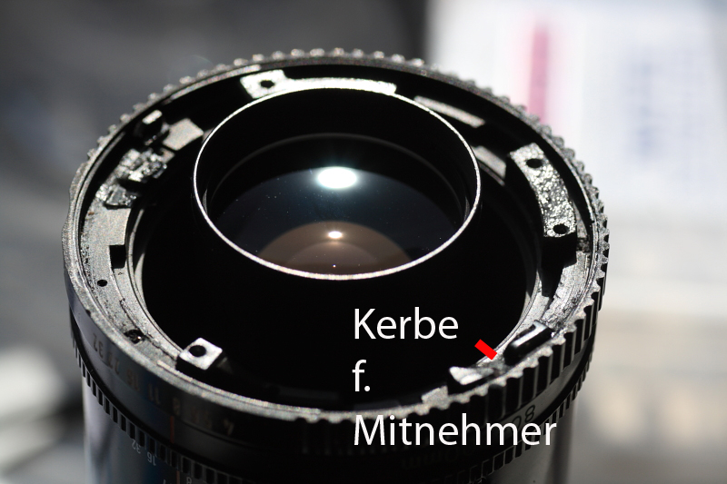 Wie man sehen kann, ist der lange Hebel nach unten ins Objektiv weisend und die kleine "Nase" auf dem Ring im 90 Grad Winkel zum späteren Blendenring weisend. Diese "Nase" ist später der Verbindungspunkt zu einer