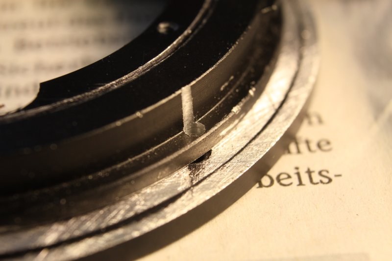 Da habe ich einen Ring noch von Hand zurechtgefeilt - und so wie es aussieht nicht genau genug. Aber anderseit erreiche ich dadurch eventuell teilweise Unendlich mit der 5D und diesem Objektiv - was für viele Bilder auch gut ist. Dewegen werde ich mir da wohl einen neuen Ring drehen müßen, und dann mal testen welche Version mir besser gefällt - das muß nicht unbedingt die Parallele sein.