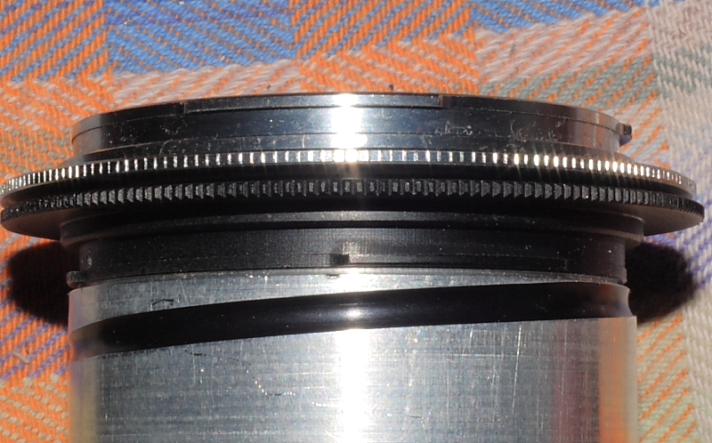 Den eingesteckten Rück-Tubus werde ich im Haupttubus in der Mitte gegen Herausziehen/Herausfallen mit insgesamt 3 Inbusschrauben festsetzen. So kann man bedenkenlos den Haupttubus noch etwas "länger" auf die 49mm "aussen" abdrehen, als ich es hier gemacht habe. Dann wäre sogar die Kombination aus dem "Vorbau" des ersten Bildes mit den 2 Adaptern und die M42 Fokussiermöglichkeit denkbar... und wird von mir auch so realisiert, damit ich eine gleichmäßige Führung des schweren Objektivs bei der Fokussierung behalte. Auch wenn versehentlich mal das Gewinde beim Fokussieren aus dem Adapter dreht, steckt dann das Objektiv noch im vorderen Adapterturm und fällt nicht versehentlich aus der Hand.