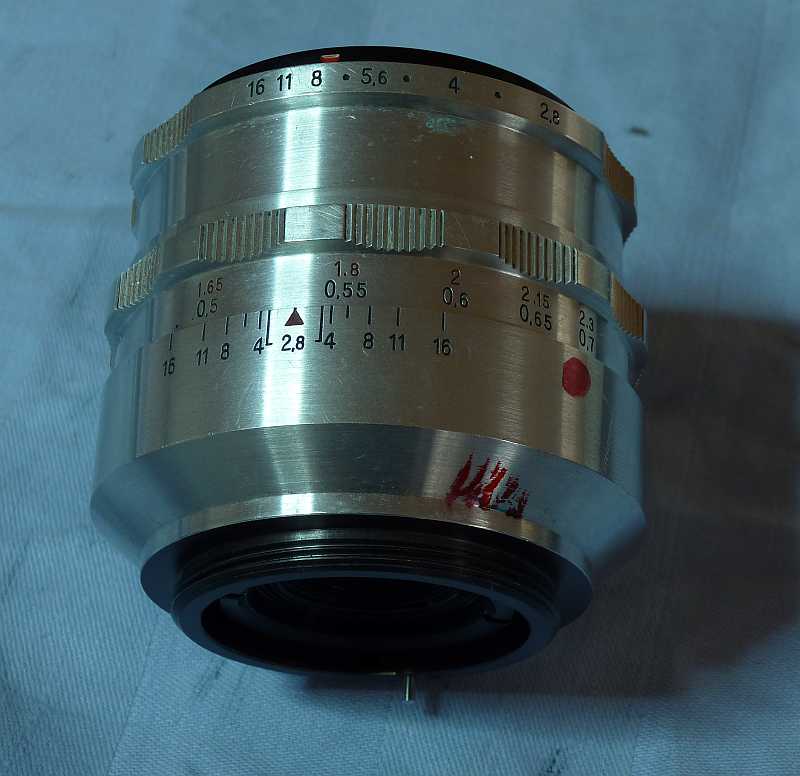 Jetzt durch vorsichtiges vor- und zurückdrehen von Fokusring in Linsenelement bzw. Hinterteil, den Klotz vor dem Schlitz im Linsenelement platzieren. Mit viel üben kann man es irgendwann fühlen und hören, denn noch helfen 2 Markierungen (Blendenring und Hinterteil), um die Stellung zu finden. Wenn es gut läuft, rastet der Blendenhebel allein ein, sonst mit kleinem Schraubenzieher nachhelfen (Blendenstößel reindrücken). Von hinten ins Objektiv blickend, lässt es sich (vage) beobachten. Wenn es passt vorsichtig zusammendrehen und die Sicherungschraube wieder eindrehen - auf Unendlichstellung (glaube ich).