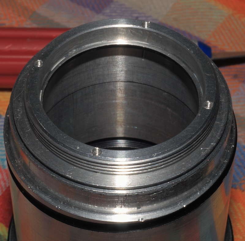 Wenn der Tubus dann auf vertretbare 49mm abgedreht wurde, kann mechanisch der von mir eingeschlagene Lösungsweg umgesetzt werden. Der Objektivtubus erhält abschließend noch einen M42 Gewindering, der mit 4 Inbusstiften M2 x 5 mm am Rumpf befestigt wird. Dieser ließe sich beispielsweise aus dem Rückteil eines billigen M42 Telekonverters gewinnen, wie sie "zu hauf" zu bekommen sind... wenn man sowas nicht schon rumliegen hat.