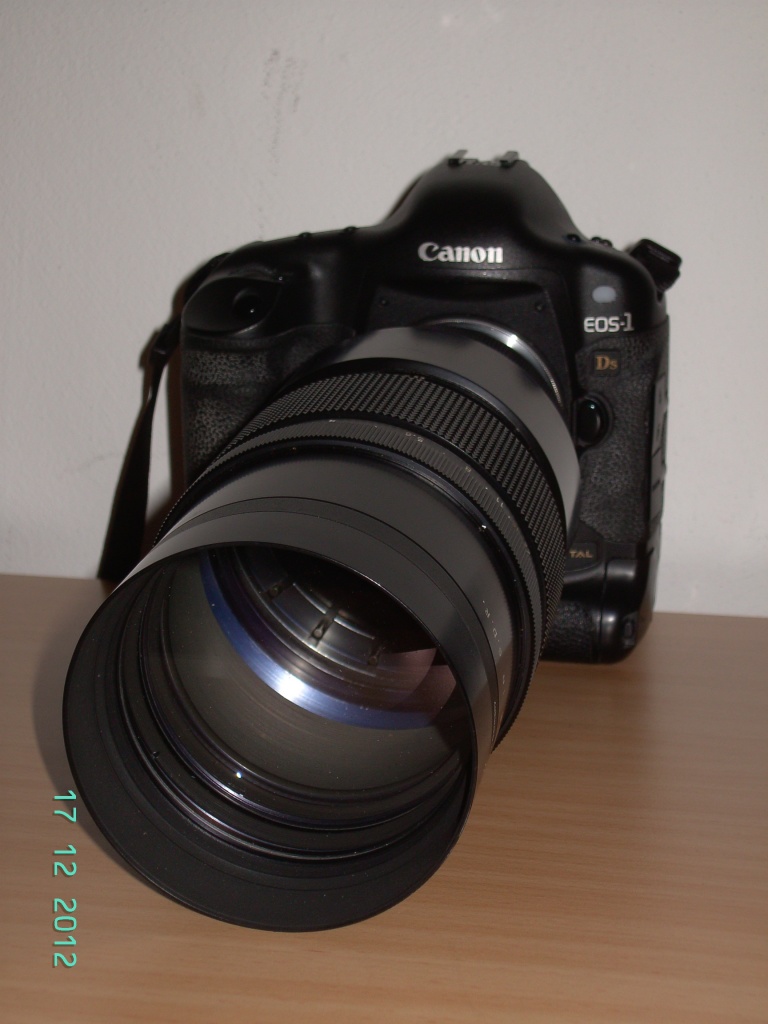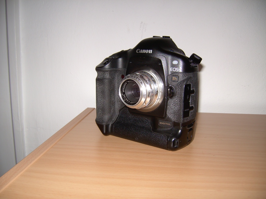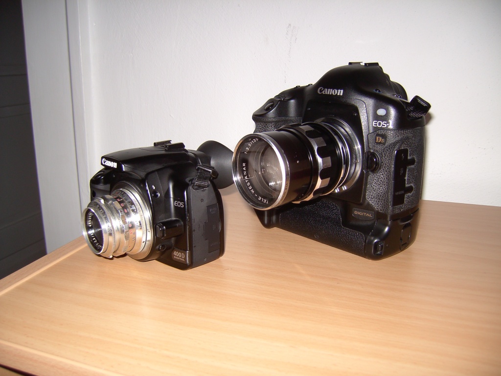 Verglichen mit einer EOS 400D wirkt das Trum schon riesig, man darf aber nicht vergessen, dass sich damit auch für die Hand eine ganz andere Angriffsfläche bietet, so dass die bessere Ergonomie einen Teil des Gewichts wett macht. An der 1 Ds das Tele Westanar 3,5/135mm, an der 400D ein Schneider Xenar 2,8/50mm.