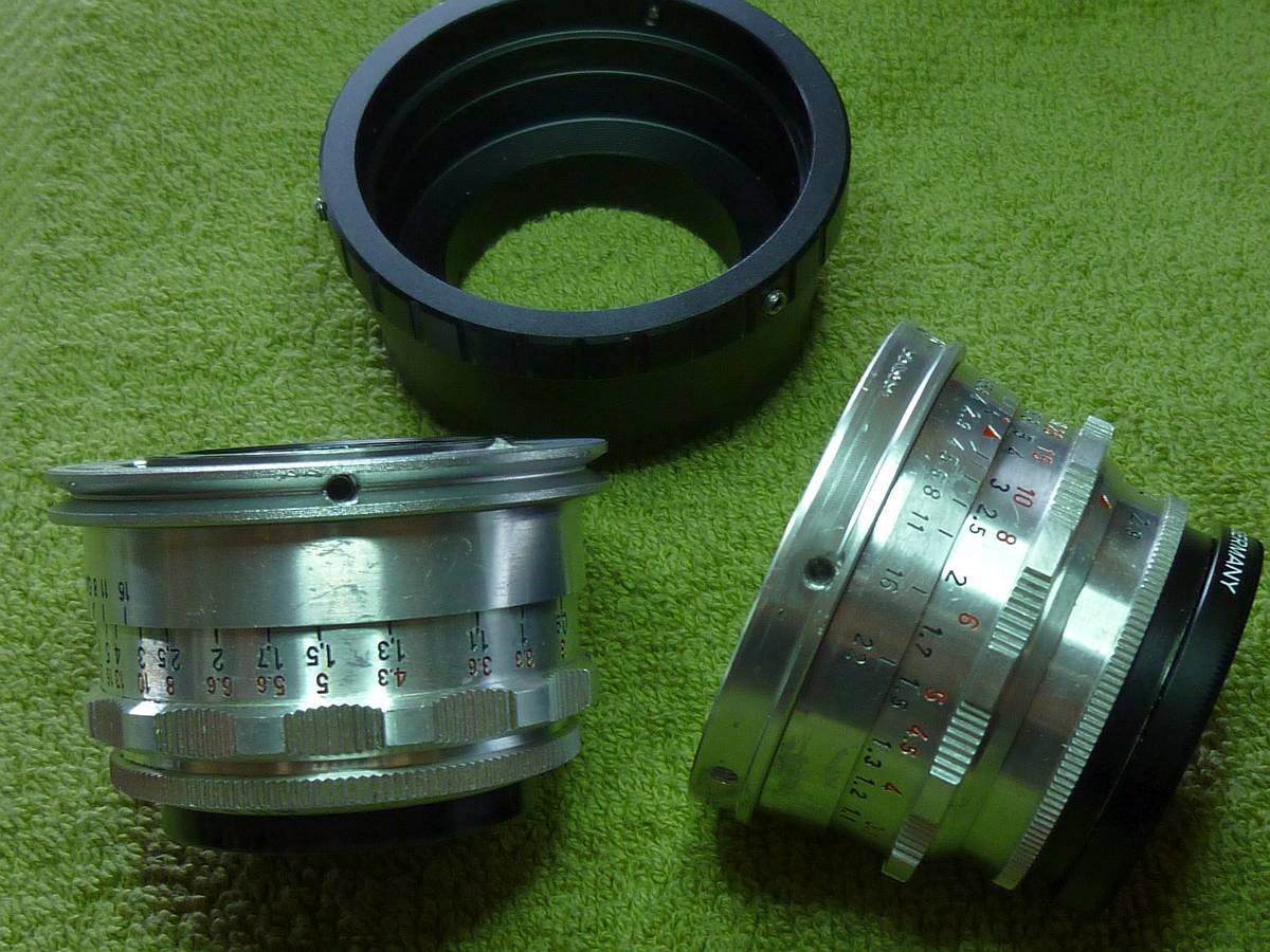 Inspiriert von Timo's Idee (#12 im Thread) hab ich M42-Adapter-Innenringe mit je drei M3-Gewinden versehen. Beim Fuji (links im Bild mit Tessar) war es einfach. Mittig in die Vertiefung gesetzt treffen die Schrauben genau auf die Verdickung am hinteren Rand der Optik.