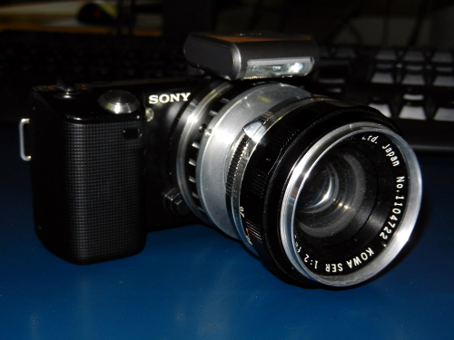 Das nächste Objektiv ist ein seltenes Kowa SER 2,0/50mm von einer Kowa SER aus dem Jahr 1967, die einen Zentralverschluß hat, der meistens nach so vielen Jahren nicht mehr funktioniert. Das Bajonett ist mit keinem anderen Bajonett kompatibel, so daß das VNEX die einige Möglichkeit ist dieses Objektiv digital zu nutzen. Das Obektiv hat wie die DKL-Bajonett-Linsen keinen Blendenring, der bleibt am Kameragehäuse. Die Blende muß mit einem Schraubenzieher hinten eingestellt und fixiert werden.