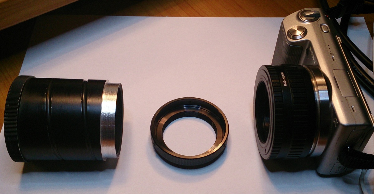 Die Adaption selbst wird bei der Lösung durch die Verwendung eines ( gerade vorhandenen) M42-T2 Adapters ermöglicht, bei dem der eigentliche