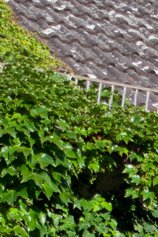 Bis hier kann ich keinen Nachteil beim Tokina erkennen. Es vignettiert etwas weniger als das Angenieux, die Mittenschärfe ist vergleichbar, die Randschärfe ist bei Offenblende beim Tokina deutlich besser als beim Angenieux (s. den Dachgiebel in der Vollauflösung) und auch wenn man das Angenieux auf f/2.8 abblendet, kann es nur knapp gleichziehen. Auch im direkten Vergleich der 100%-Crops bei f/2.8 scheint mir das Tokina einen Hauch kontrastreicher abzubilden (Dachziegel) und minimal weniger zu Überstrahlungen zu neigen (Glanzlichter auf den Blättern).