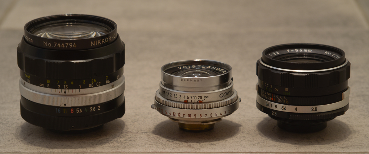 Gruppenbild mit Nikkor-O 35/2 Auto und Soligor 35/2,8 mit T2 (der T2-Adapter hatte heute seinen freien Tag). Das Voigtländer ist eindeutig das Kleinste.