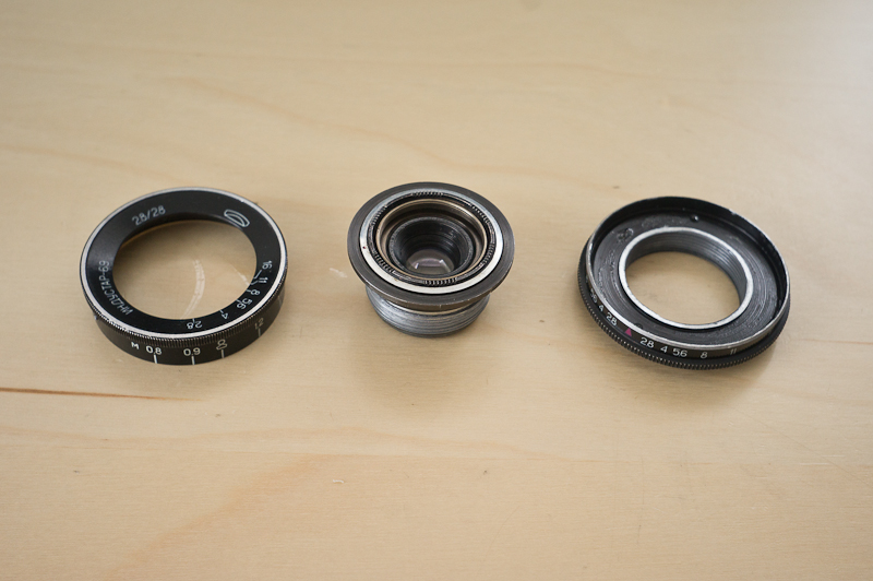 Das Objektiv besteht im Wesentlichen nur aus drei großen Baugruppen: dem Oberteil mit Entfernungs- und Blendenangaben, dem Linsenelement mit Blende und dem Unterteil mit M39 Gewinde und Schärfentiefenskala: