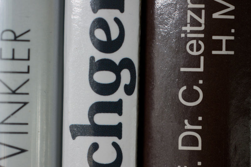 Das Summicron kann mit seiner für Messsucher Objektive typischen Naheinstellgrenze von 70cm keinen Blumentopf gewinnen und Blumen können damit nicht formatfüllend abgebildet werden. Es erreicht nur einen maxiamlen Abbildungsmassstab von 1:11, VNEX schon einen von 1:3,5 und das Macro Rokkor 1:2. Schärfe und Auflösung ist sowohl beim Componon und Rokkor sehr gut. Man kann gut die einzelnen Farbpunkt der Buchstaben in der Bildmitte erkennen. Durch die Kompaktheit hat das VNEX System hier auch noch einen kleinen weiteren Vorteil, je nach Lichtverhältnissen kommen es nicht zu so starken Abschattungen durch das Objektiv wie bei dem Rokkor.