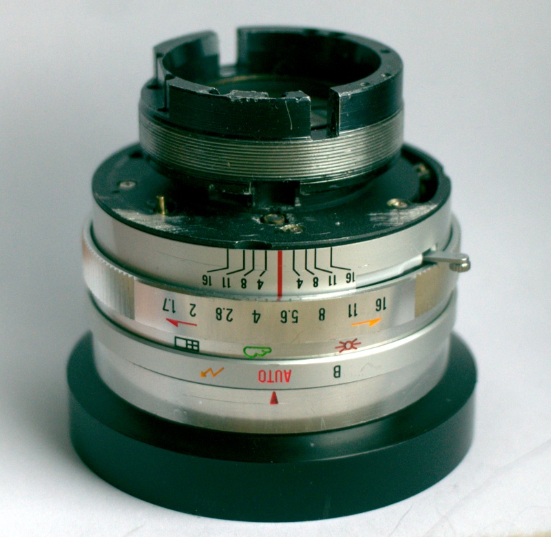 Die drei Schrauben im Inneren haben sich - möglicherweise durch ganz normale Benutzung - etwas gelockert. Irgendwann ist dann die erste Verschlusslamelle aus der Führung gerutscht und die Kamera war unbrauchbar. Der Besitzer hat dann einen Reparaturversuch gestartet und den Frontring mit irgendeinem groben Werkzeug traktiert. Dabei hat er beträchtliche Kraft aufgewendet und ist auch mehrfach abgerutscht wodurch aus den Kerben Riefen wurden. Dazu passt auch, dass sich der Blendenring nicht mehr so leicht drehen lässt, wie ich es erwartet hätte. Es fühlt sich etwas unrund an.