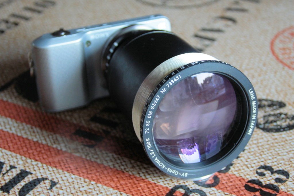 Hierbei handelt es sich um eine BV-Optik KOWA 1,5/100mm - ein Riesenglasklotz mit 625g, rund 12,5cm lang und 8,5cm Durchmesser an der dicksten Stelle. Die Frontlinse hat einen Durchmesser von 67mm.