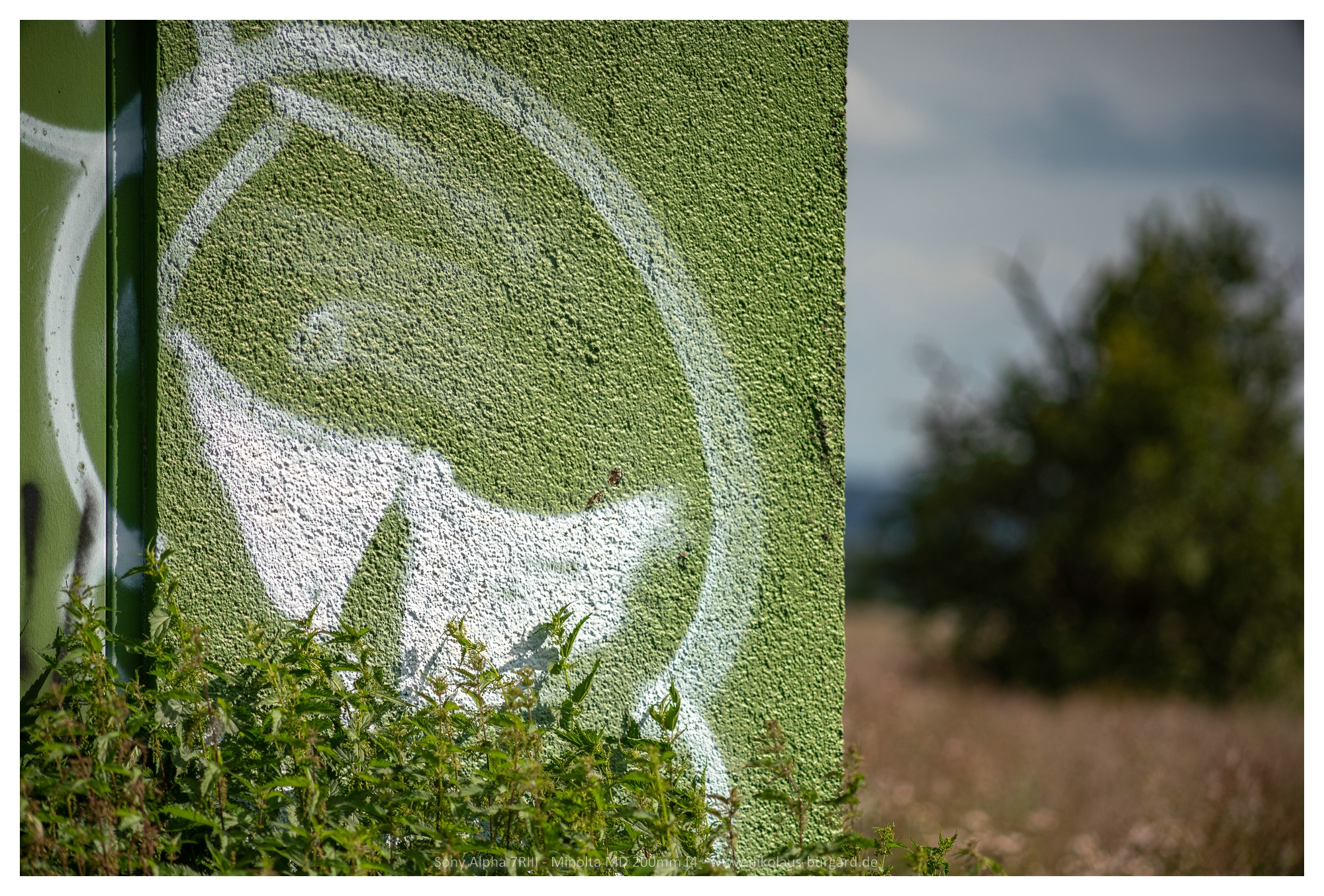 Bereits bei offener Blende gute Auflösung und viele Details. Mit Abblenden nimmt der Mikrokontrast noch etwas zu und die Strukturen treten plastischer hervor. Gut zu sehen an dem Putz unten oder auch an der abblätternden Farbe in der Mitte.