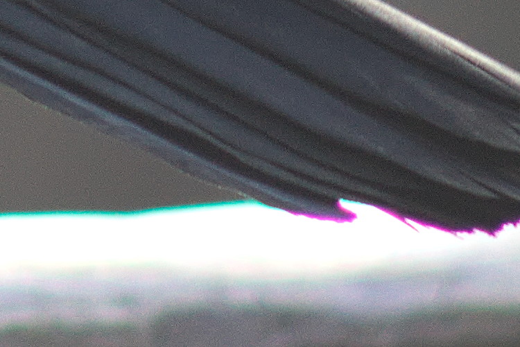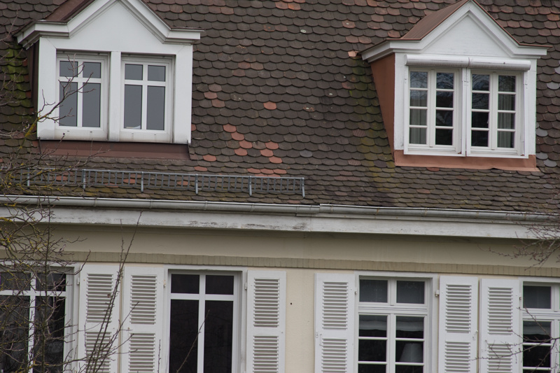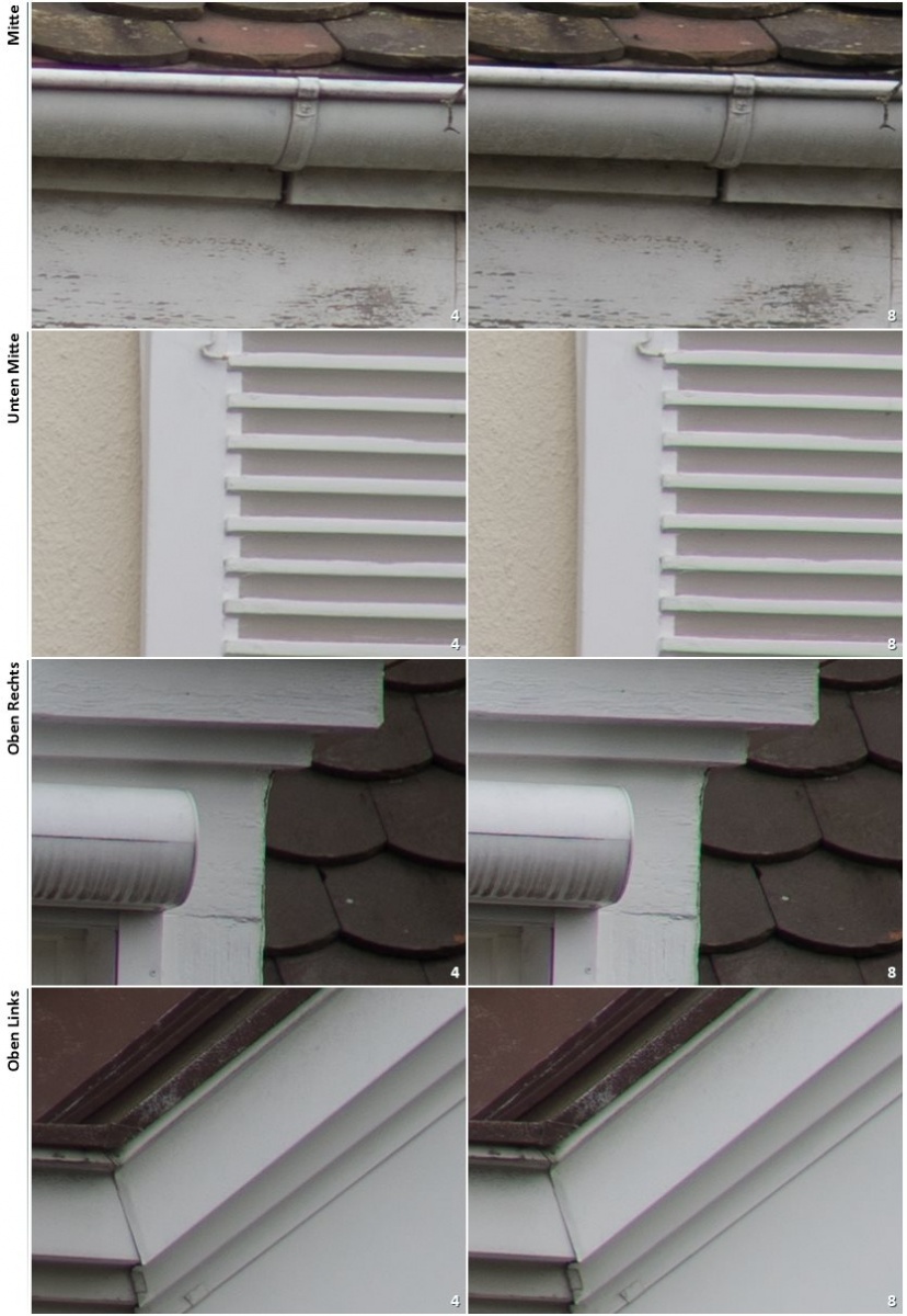 Bei offener Blende gibt es Farbsäume an den Kontrastkanten (z.B. oberhalb der Regenrinne, oder rechts am Rand des weißen Dacherkers). Mit Abblenden verschwinden sie in der Bildmitte, sind aber auch bei Blende 8 noch an den Bildrändern vorhanden.