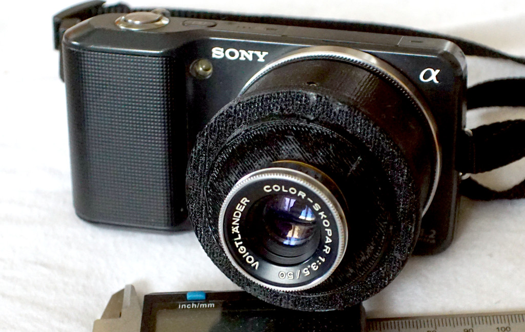Objektiv: Voigtländer Color-Skopar 1:3,5/50 Objektivrumpf ohne Fokusschnecke aber mit funktionierender Blende. Ich habe diese Linse mit einem selbst ausgedrucktem Adapter auf M42 short adaptiert.