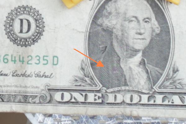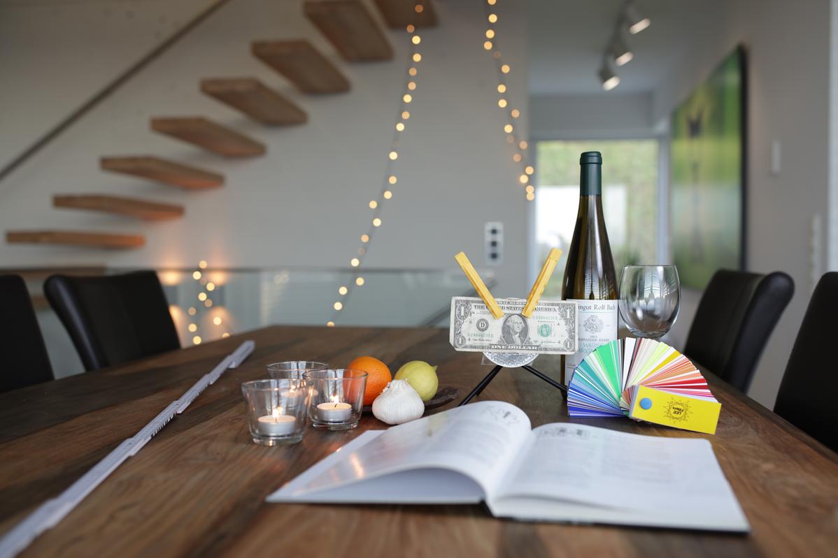 Der Geldschein selbst liegt in seiner gesamten Fläche nur ungefähr parallel zur Sensorebene. Ebenso befinden sich die platzierten Gegenstände nicht zwingend in der Schärfeebene bzw. im Schärfekonus. Die Weinflasche befindet sich z.B. absichtlich etwas hinter der Schärfeebene, um den Übergang beurteilen zu können.