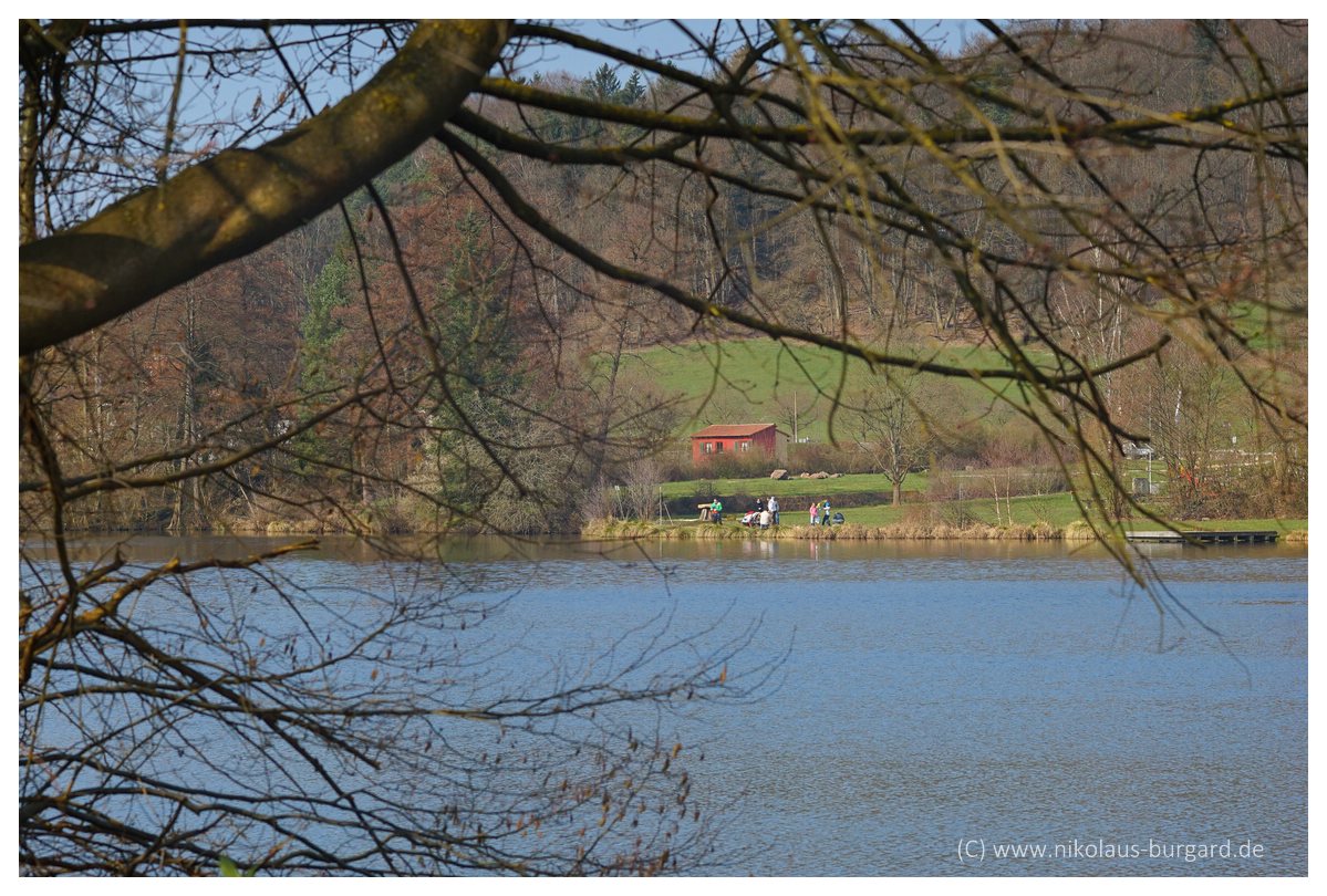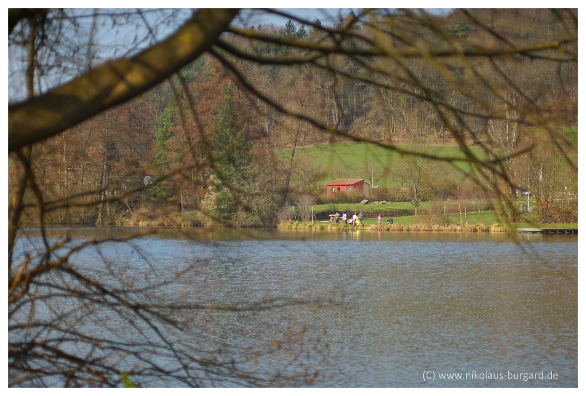 Die Schärfe liegt jeweils auf der roten Hütte am anderen Seeufer.