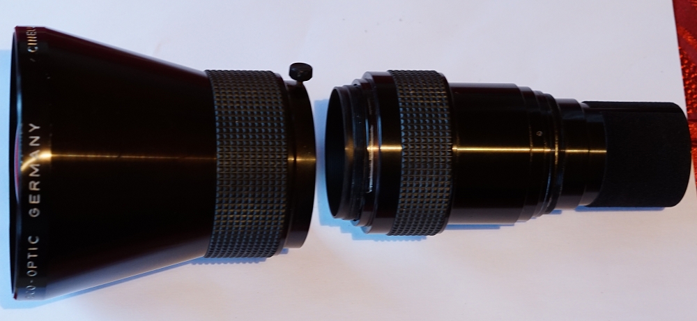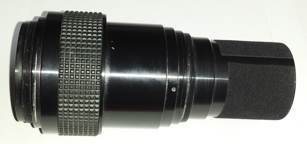 Den M65 Helicoid inkl 62,5 mm Aufnahme hatte ich schon für andere Projektionsobjektive. Dann habe ich mir aus dem Teichbedarf ein 63mm Rohr gekauft, auf der einen Seite so viel abgefeilt, bis es nur noch 62,5mm waren (Sieht leider etwas unordentlich aus). Das Objektiv nimmt in der Breite zu. es gibt eine Stelle, die fast genau in den Innenraum des Rohrs passt. Daher habe ich das Rohr am Eingang mit etwas schwarzem matten Klebeband ausgeklebt, so dass es genau passte. Wegen des Gewichst des Objektivs reichte eine einfache Fixierung durch das einpressen an einer Stelle allerdings nicht. So habe ich 4 Löcher etwas weiter hinten in das Rohr gebohrt, von innen 4 kleine Muttern gesetzt und halte das Objektiv jetzt mit 4 Schrauben jetzt dort noch einmal zentriert fest. Die Schrauben momentan sind leider noch etwas lang. Die 10mm Schrauben waren etwas zu kurz und etwas dazwischen hatte ich gerade nicht - wird aber noch getauscht.