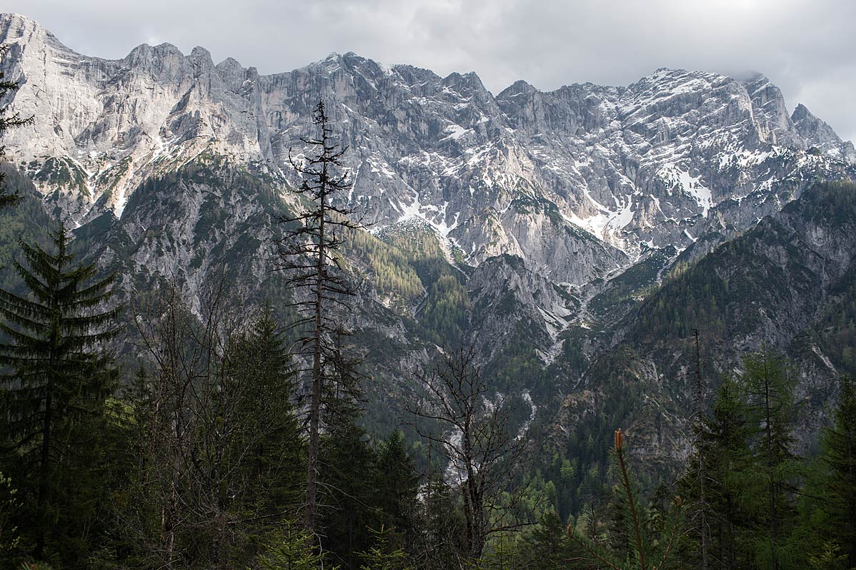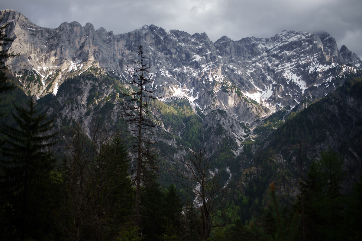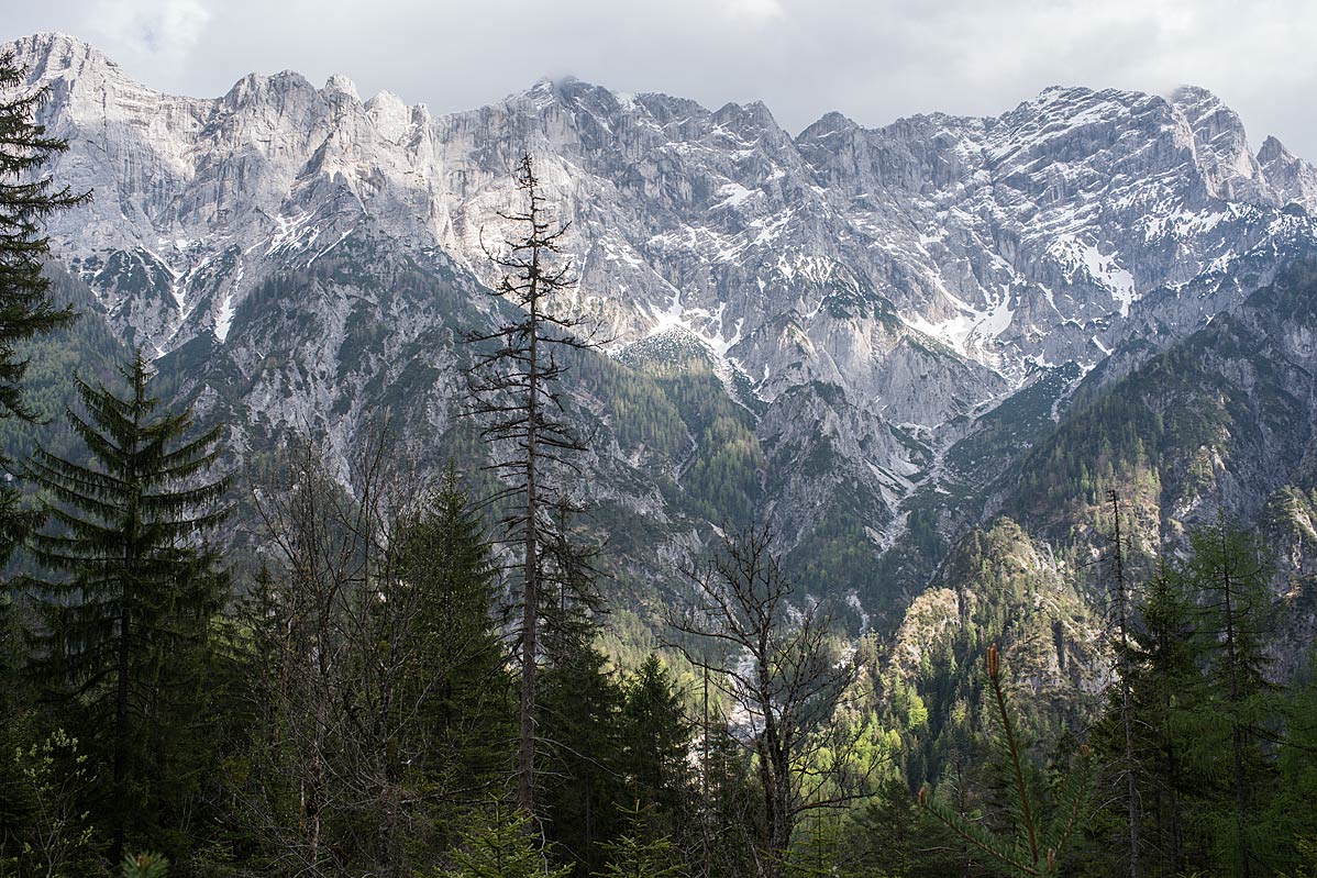 Weiter gehts: Ein Blick auf das Haindlkar. Fokussiert hatte ich auf den etwas kahleren Baum links von der Bildmitte. Erst Blende offen/2.8, dann Blende 8: