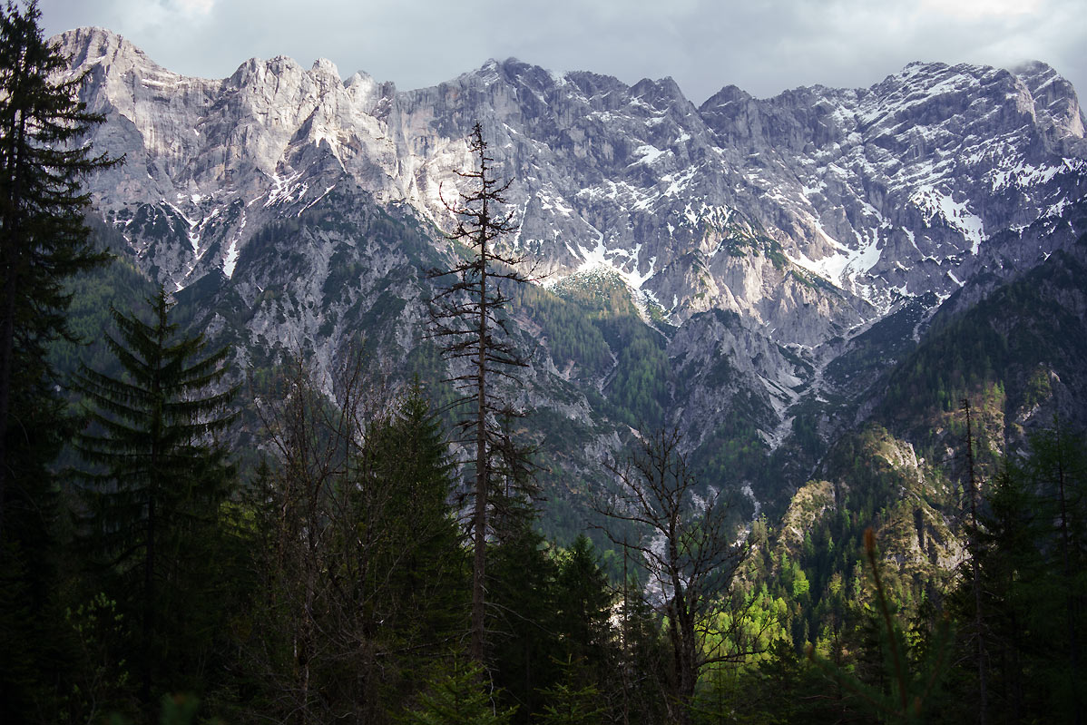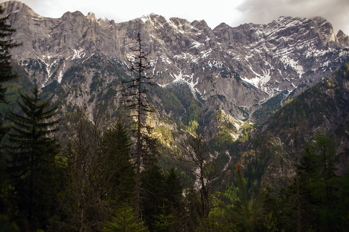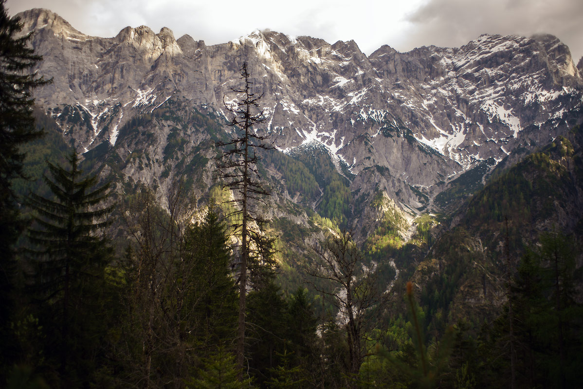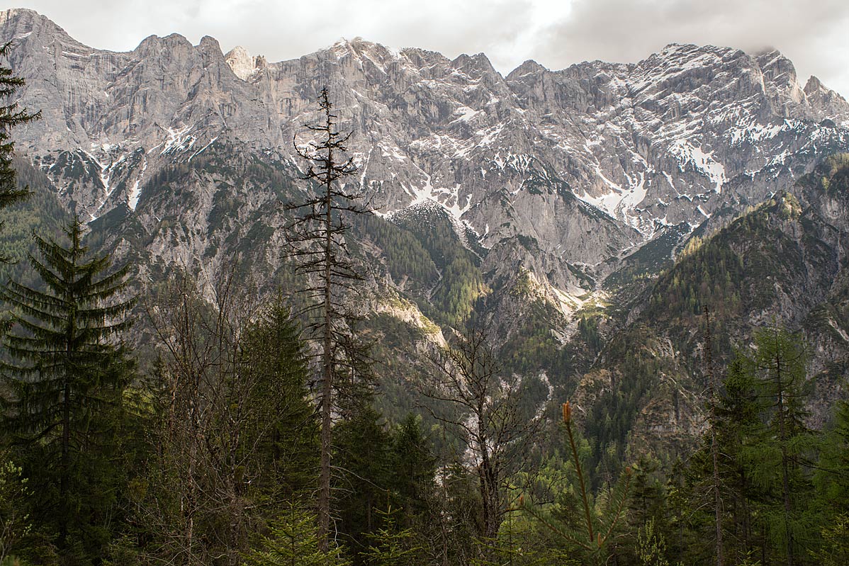 Weiter gehts: Ein Blick auf das Haindlkar. Fokussiert hatte ich auf den etwas kahleren Baum links von der Bildmitte. Erst Blende offen/2.8, dann Blende 8: