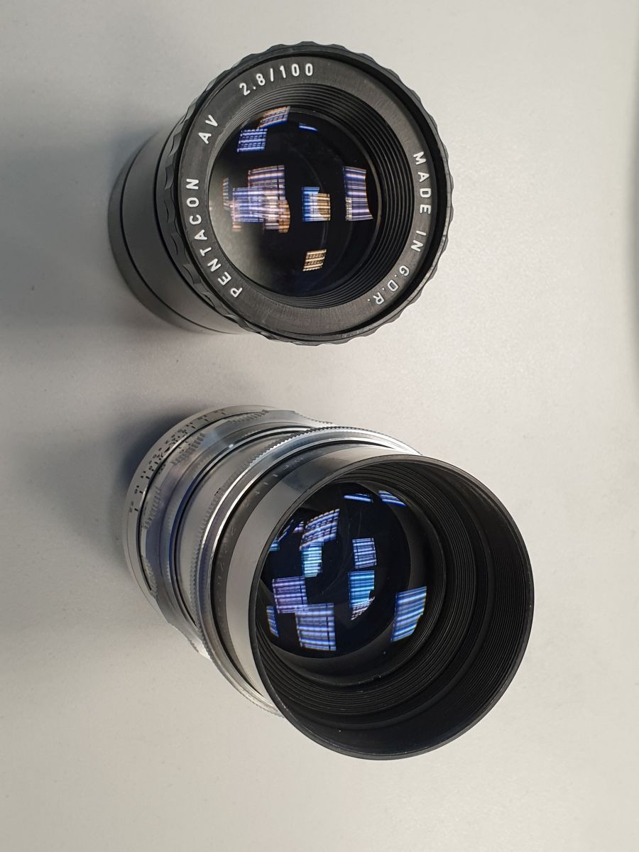 ich habe als Beifang ein Pentacon AV 100 2.8 Projektionsobjektiv geangelt. Die Linsen sehen von der Beschichtung nach MC aus.