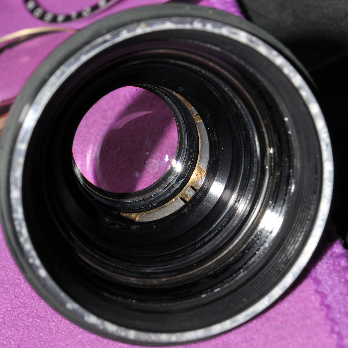 Offenbar war das Objektiv in Meerwasser gelegen, was die Salzkrusten und Rostspuren nahelegen, und die Blendenlamellen sind dann verrostet.