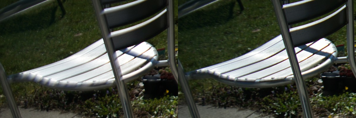 Blick auf Metall in der Sonne, f/1,8 und f/2,8. CAs sind gut korrigiert und kaum wahrnehmbares Purple Fringing (eher zartblau hier):