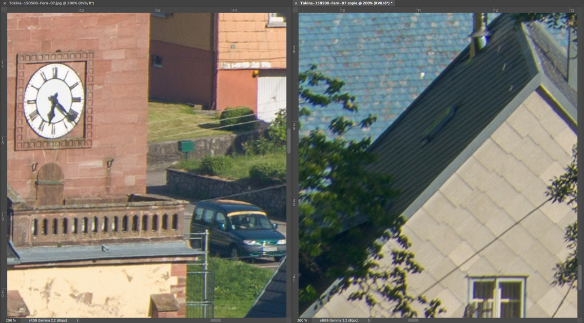 Nachfolgend eine Testserie bei Unendlich, mit der Sony A7R nebst Stativ und 10 s Selbstauslöservorlauf bei 100 ISO fotografiert. Es wurde mit maximaler Lupenvergrösserung auf das Ziffernblatt der Kirchturmuhr scharfgestellt. Die Bilder wurden nur mit Standardeinstellung in Camera Raw geschärft, die chromatischen Abberationen bleiben unkorrigiert. Letztere sind aber sehr moderat und in Camera Raw noch gut beherrschbar. Nach der automatischen Korrektion verschwinden sie fast vollständig. Bedenkt bitte, dass es sich hier um fast ungeschärfte Ausschnitte in 200% - Vergrösserung handelt.