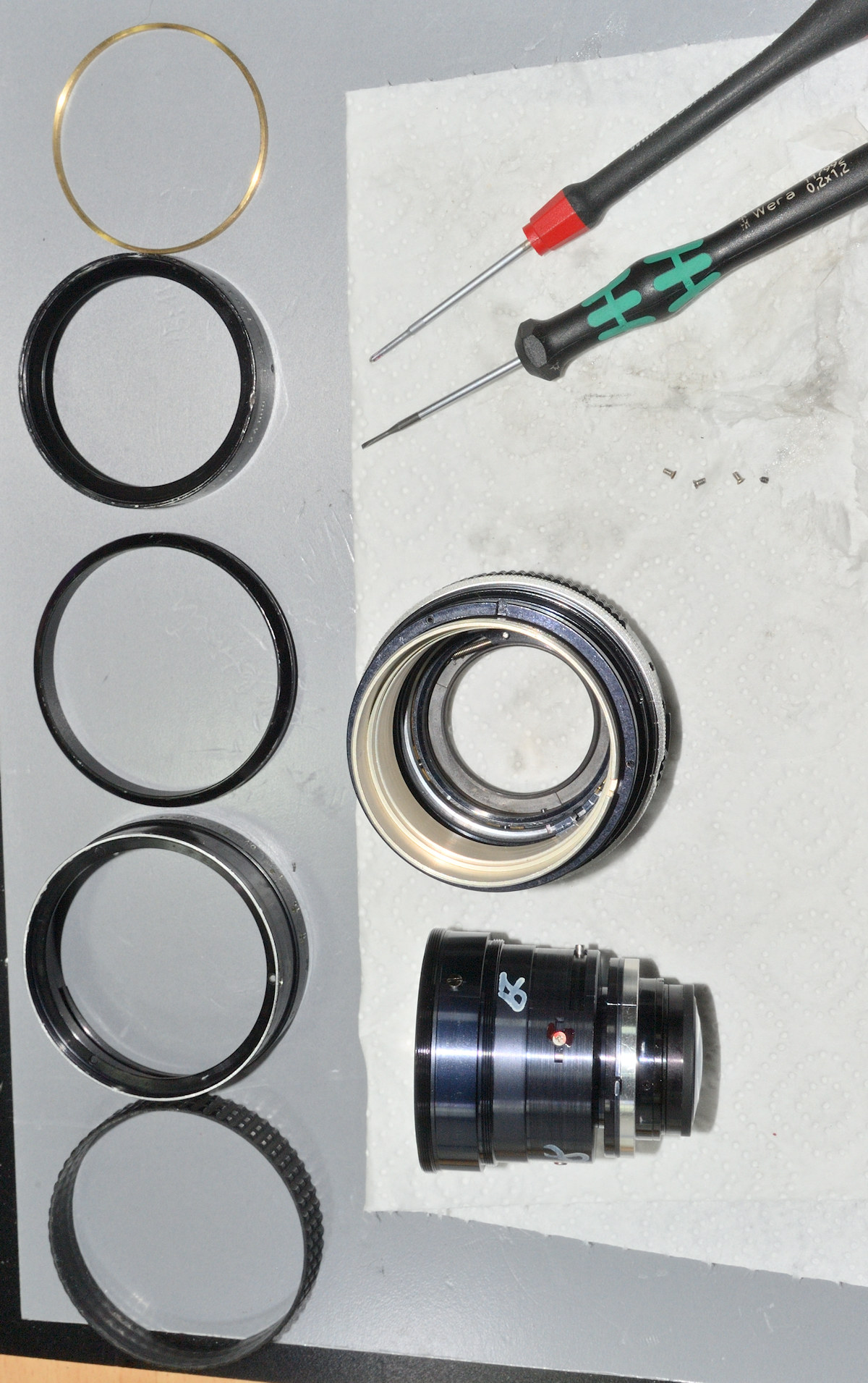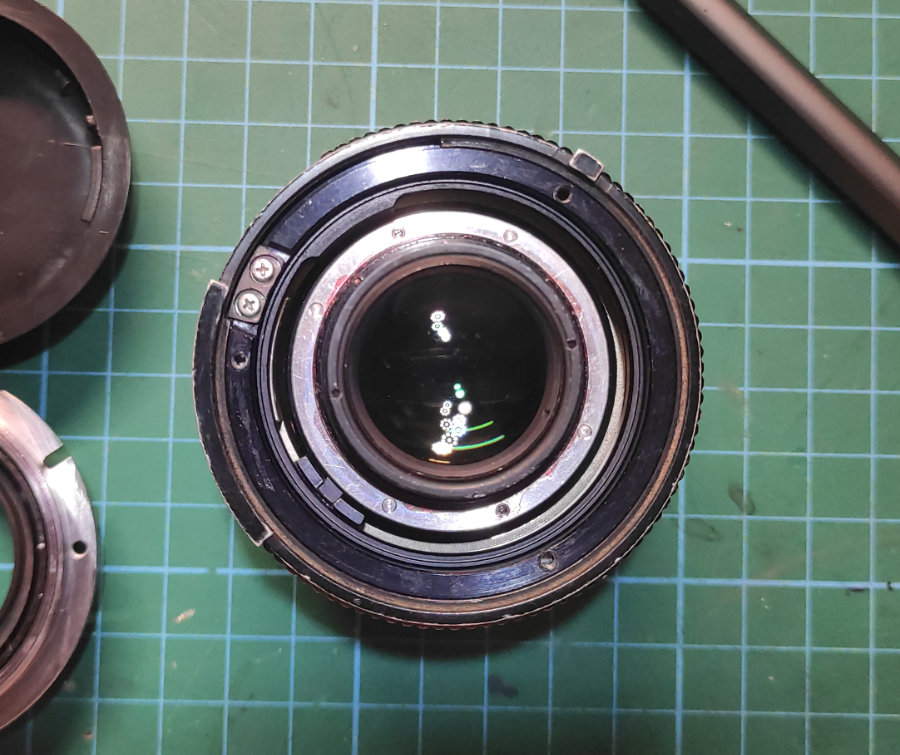 Um an den Fokusschneckengang heran zu kommen, muss man nur den kompletten Linsensatz heraus nehmen (Blende auf f/22, Fokus auf 0,3 m - und danach genau so wieder einsetzen):