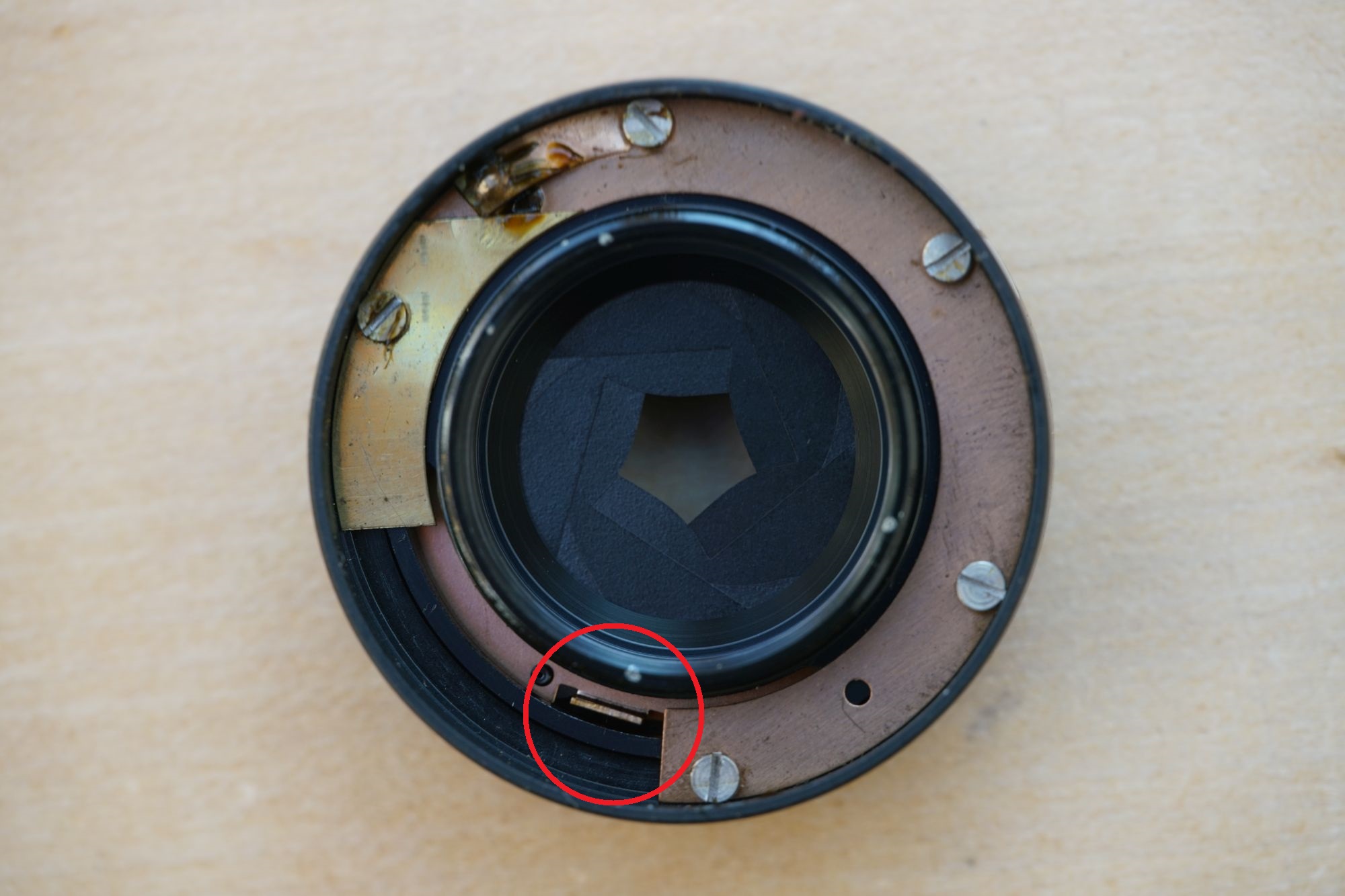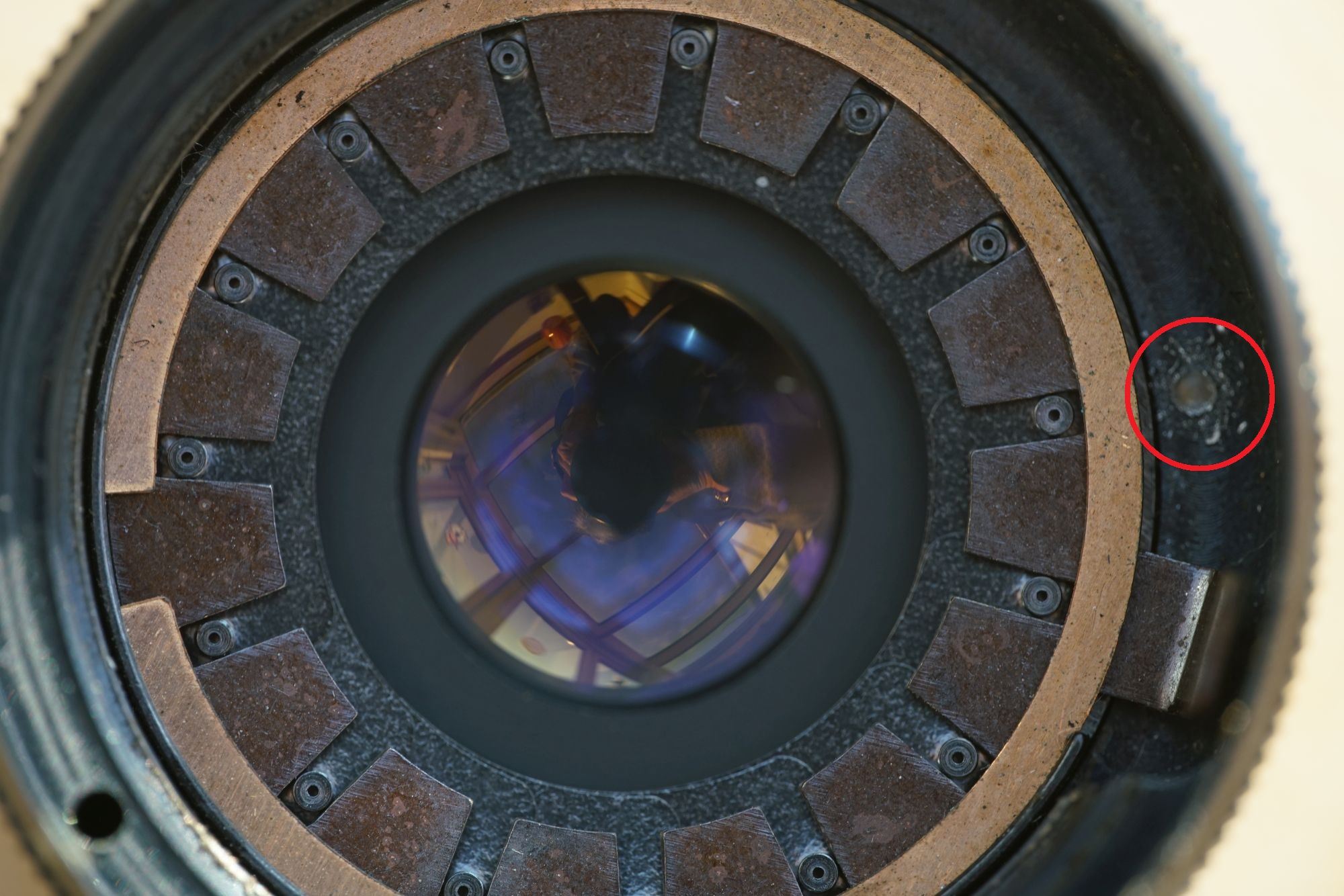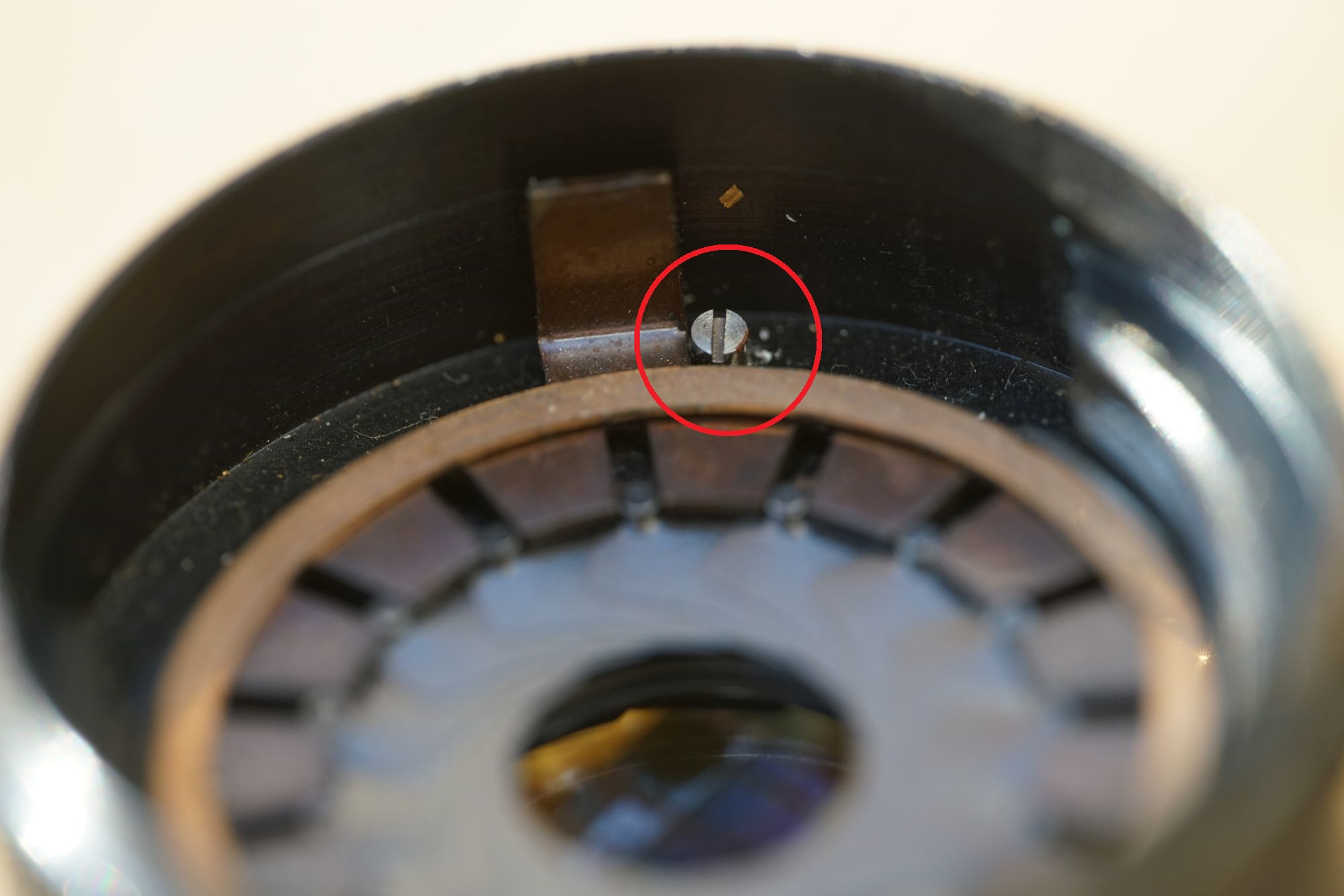 Ist der Ring entfernt, sieht man den Blendenmechanismus und den Grund für die nicht ganz öffnende Blende: eine