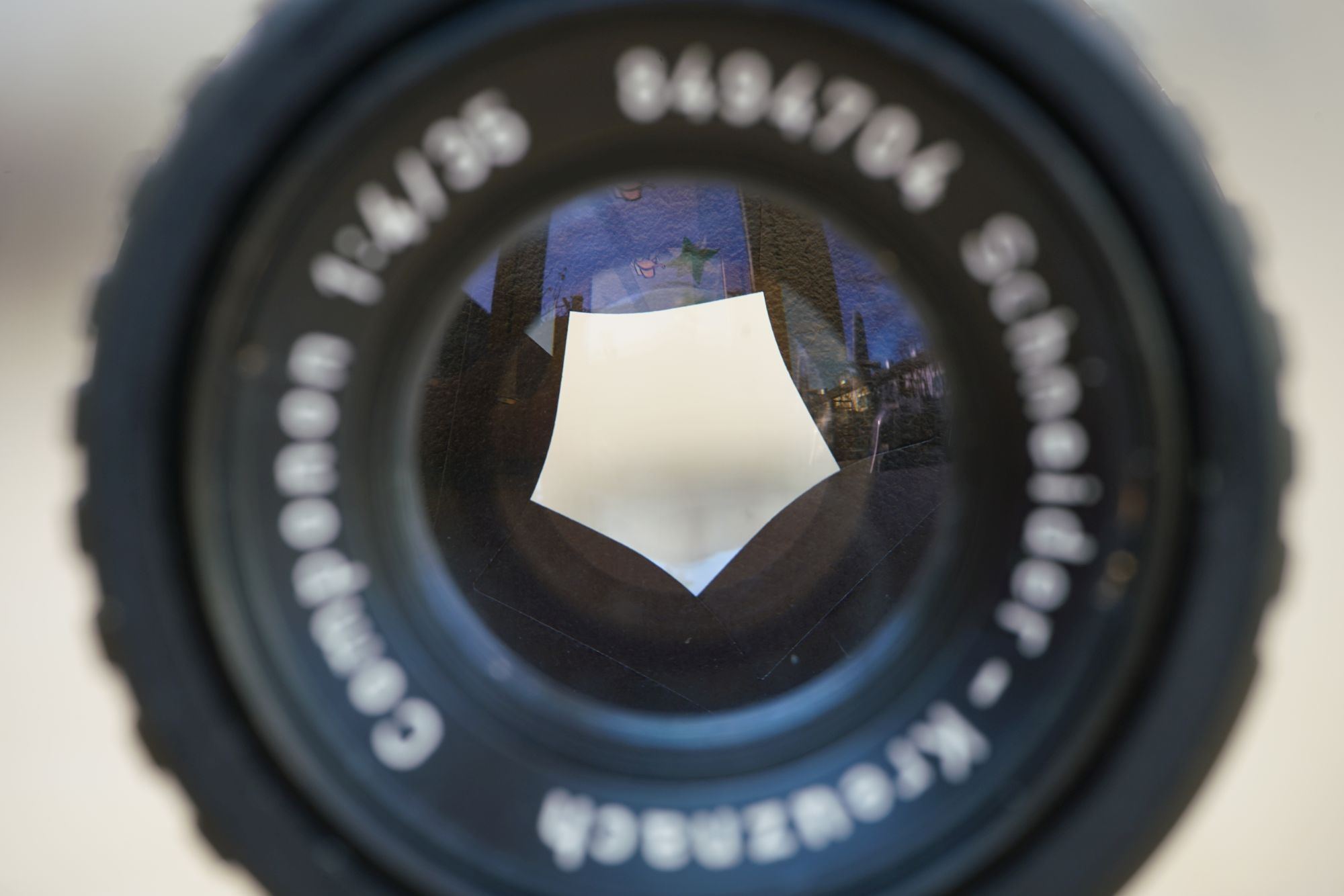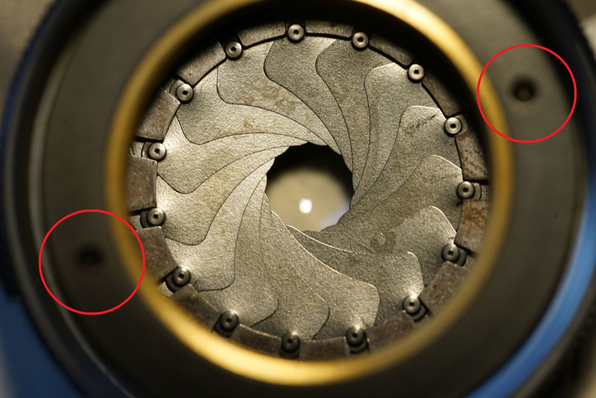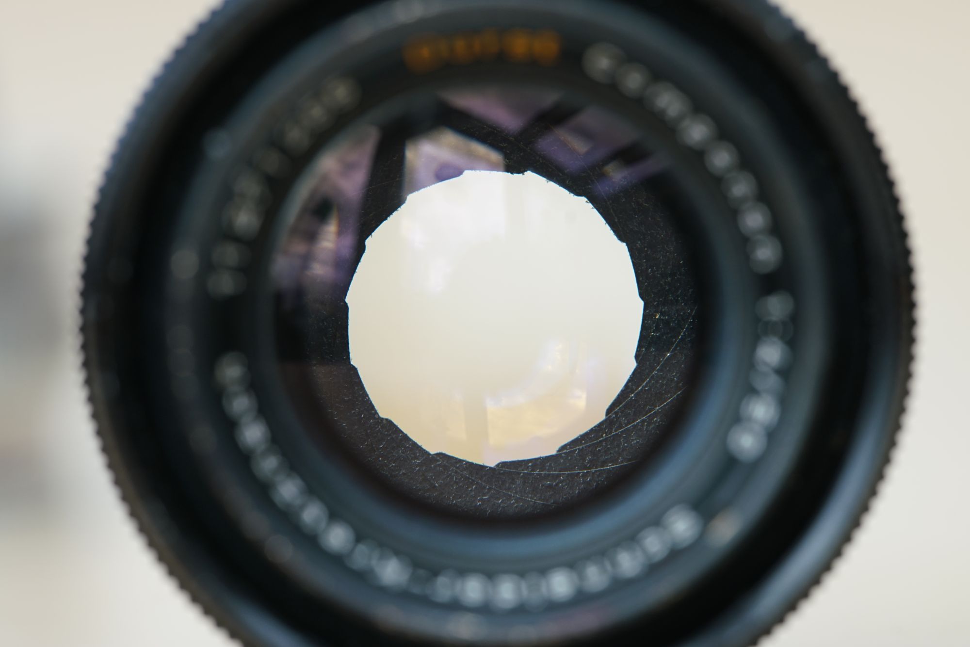 Ist der Ring entfernt, sieht man den Blendenmechanismus und den Grund für die nicht ganz öffnende Blende: eine