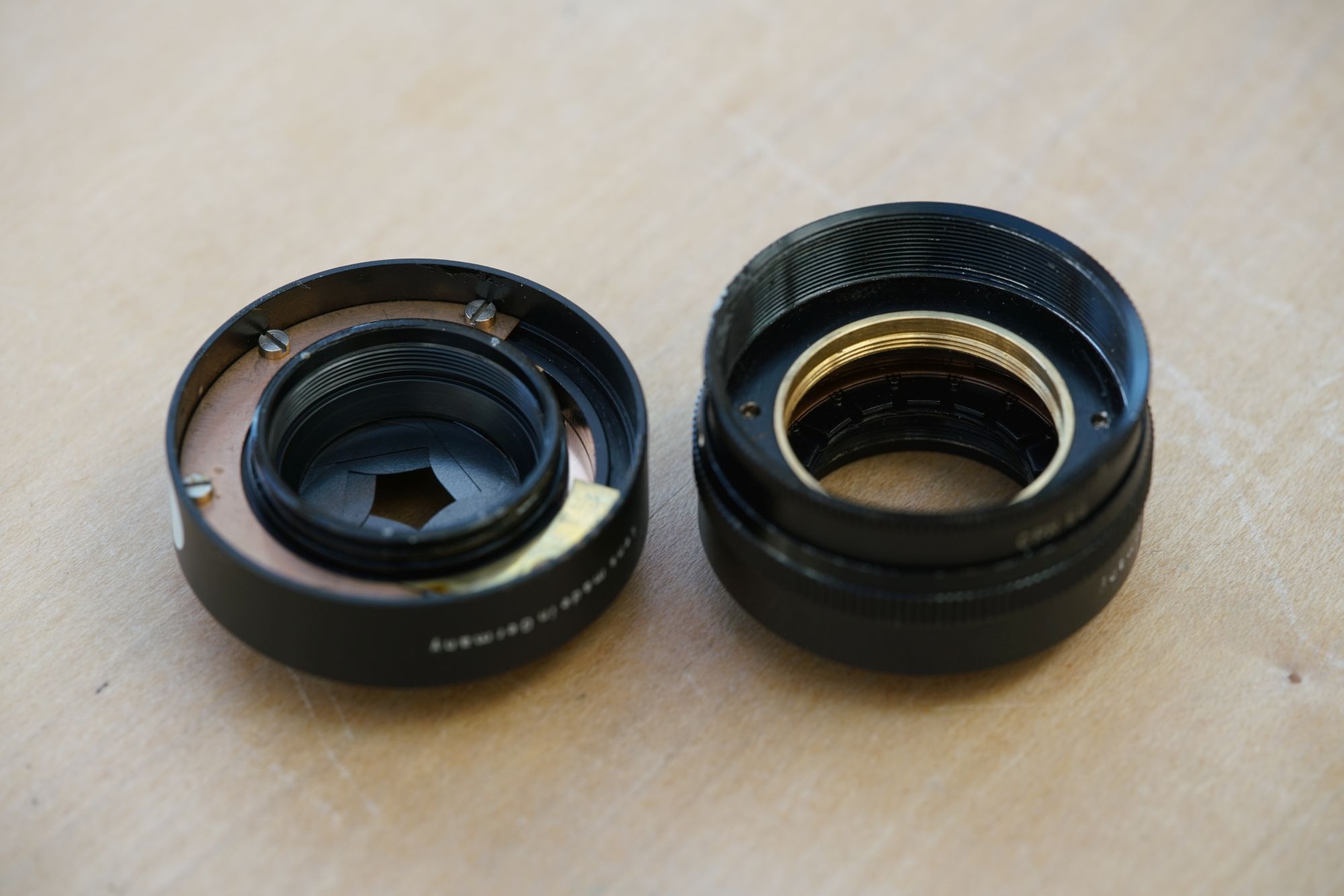 Man kann beide Linsenblöcke (vorne und hinten) ganz einfach herausdrehen. Dann ist der Blick auf die Blende frei.