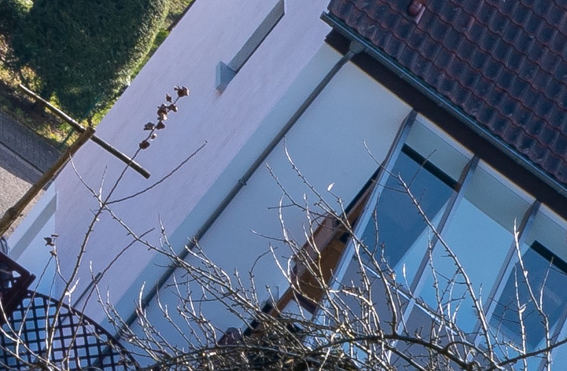 Hierzu habe ich vom Stativ Fotos einer Häuserreihe angefertigt, bei der sowohl das Bildzentrum als auch die Bildecke in einer Schärfeebene liegen.
