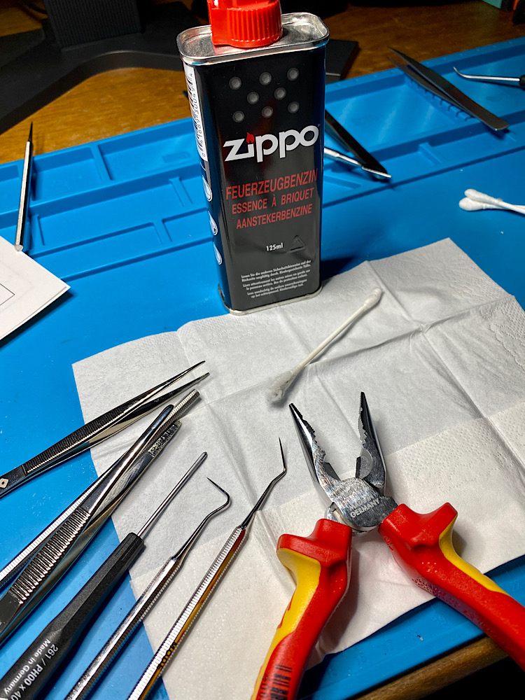 Das beteiligte Werkzeug wird mit Feuerzeugbenzin und Wattestäbchen von den klebrigen Schaumgummiresten gereinigt: