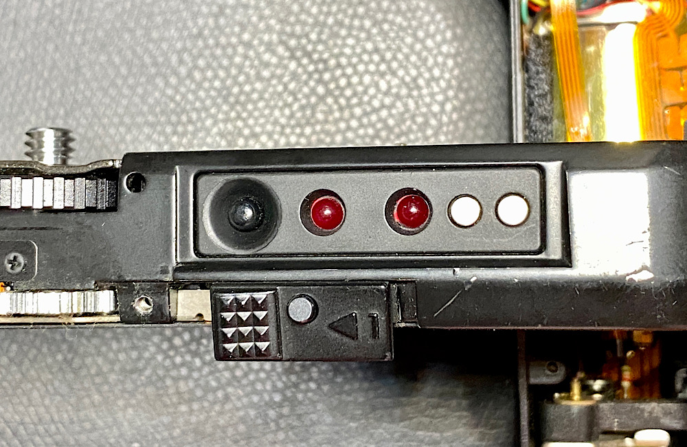 An dieser Stelle befinden sich neben elektronischen Bauteilen auch zwei große Schalter mit Verkabelung, die Achse für das Rückspulen des belichteten Films und der Ansatzpunkt für ein Übertragungsgestänge, das in einen Aufbau auf der Achse greift.
