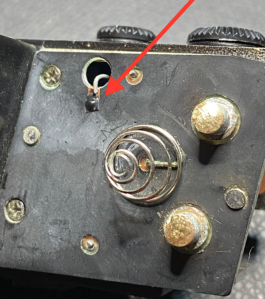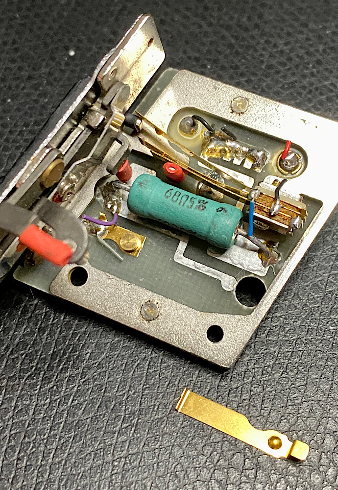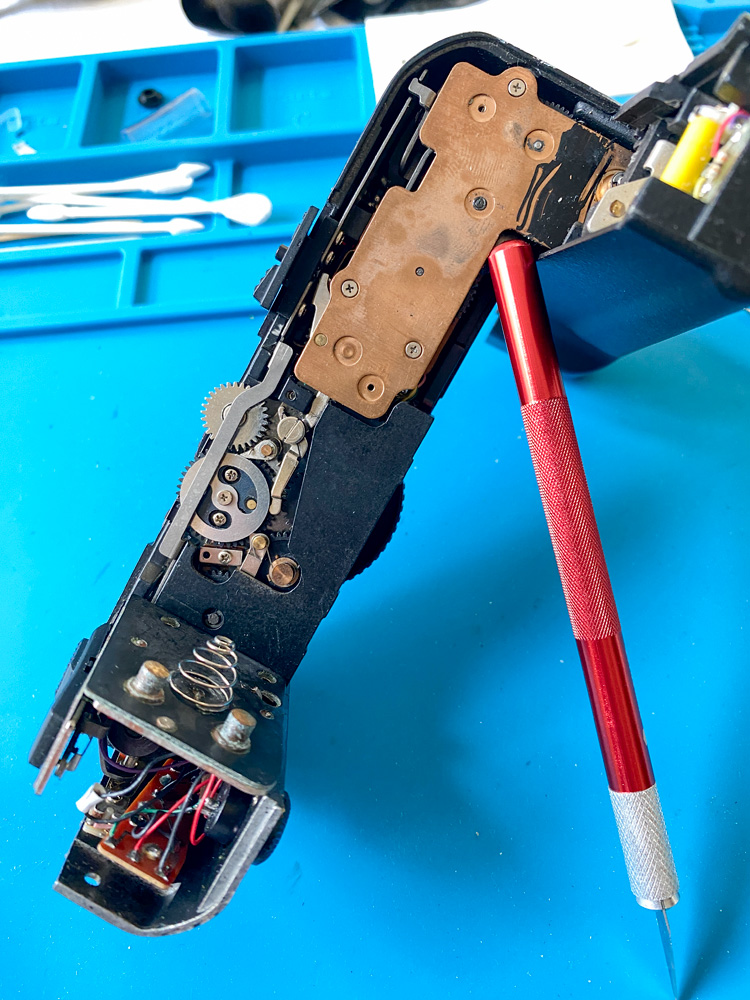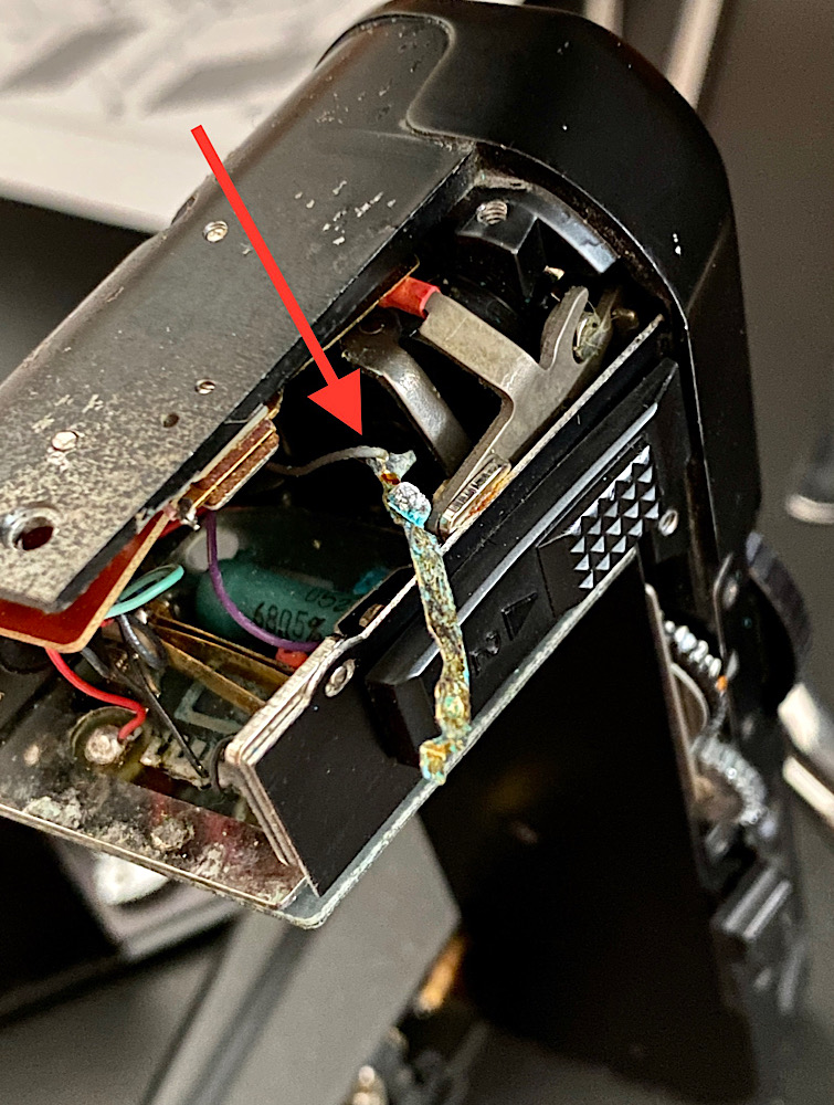 Dummerweise hatte ich von dieser Platine aus einem zu Lehrzwecken sektierten Nikon Motor Drive MD-4 den Schalterkontakt für die Batteriekontrolle abgetrennt. Um seine Funktion besser darstellen zu können.