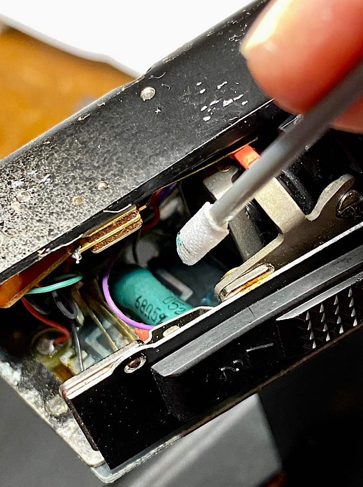Ich hätte ihn zwar reinigen und wieder einlöten können. Aber dazu hätte ich die Platte ausbauen und die eingekuppelte Mechanik für die Rückspulfunktion entfernen müssen. Das war mir zu riskant.