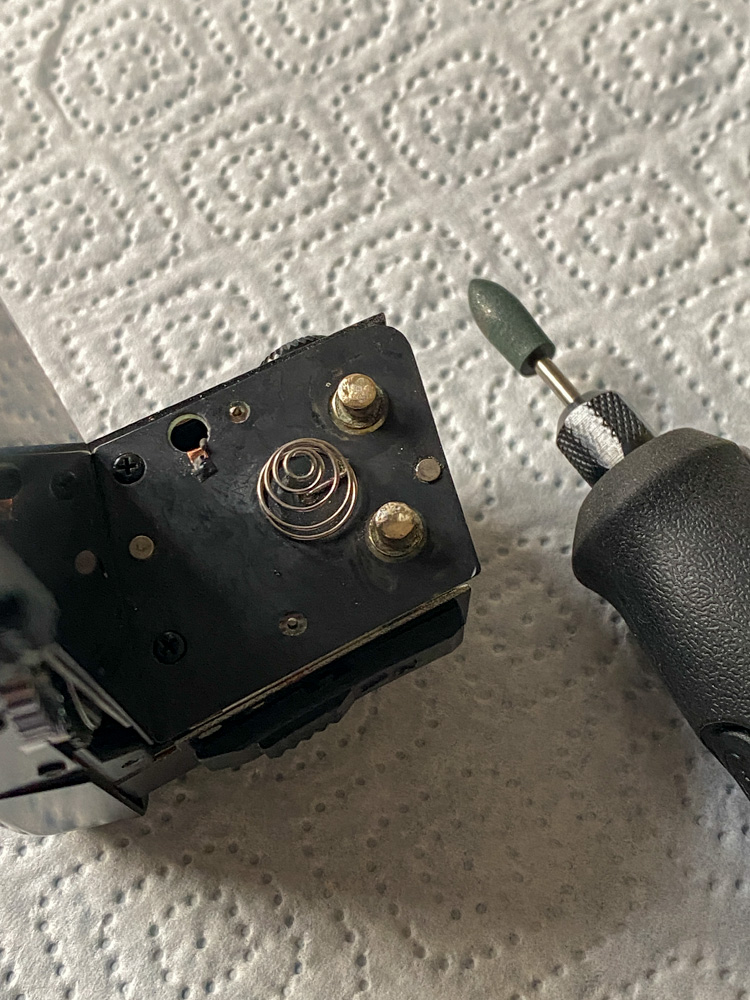 Um Oxidation zu vermeiden, verzinne ich die Kontakte mit dem Lötkolben und poliere sie anschließend mit der Hartgummispitze am Dremel Stylo: