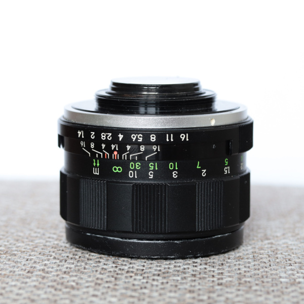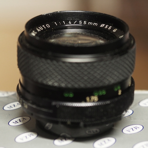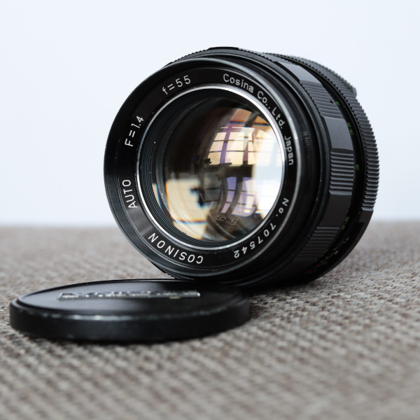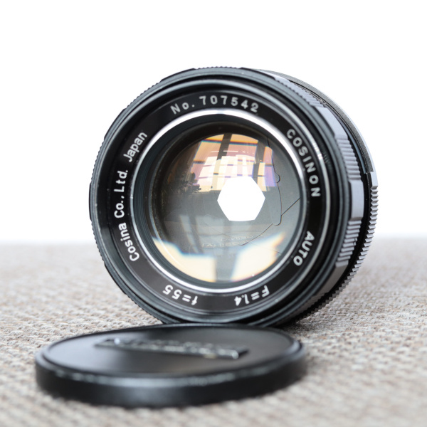 Cosina Cosinon Auto F=1.4 f=55 sollte die gleiche Linse sein. Die Vergütung schimmert jedoch mehr golden-violet als blau. Ich nutze das Objektiv hauptsächlich für analog auf einer Zenit oder Praktica. Digital auf APS-C bin ich jedoch nicht so richtig warm geworden mit dem Objektiv. Die Version ist vollständig aus Metall, abgesehen von dem A/M-Umschalter. Sogar Originaldeckel ist aus Alu.