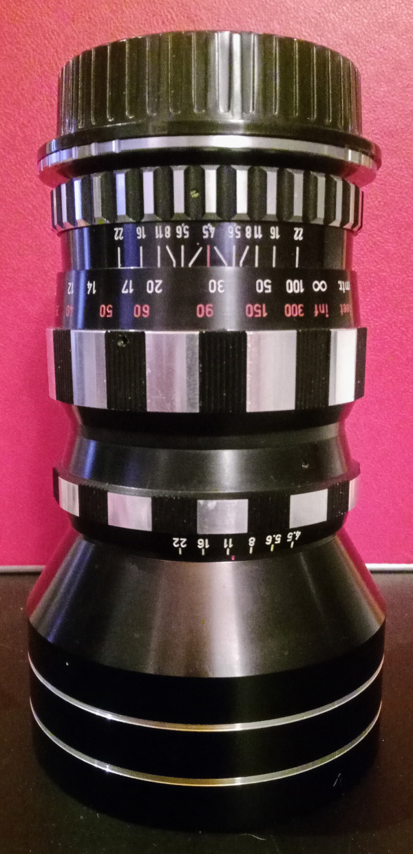 Ein kleiner, aber schwerer Brocken, und relativ selten: Das Enna Tele-Ennalyt 4,5/200mm. Rastblende, einfache Schneckenfokussierung, E74 Frontgewinde.