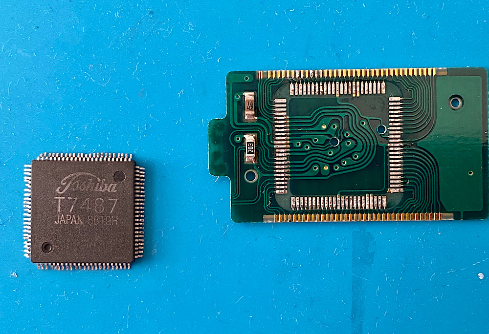 Als Kandidaten für den Versuch mussten der mutmaßlich defekte IC und seine Platine herhalten, die ich unlängst aus einer T90 mit Displayfehler herausgeholt hatte.