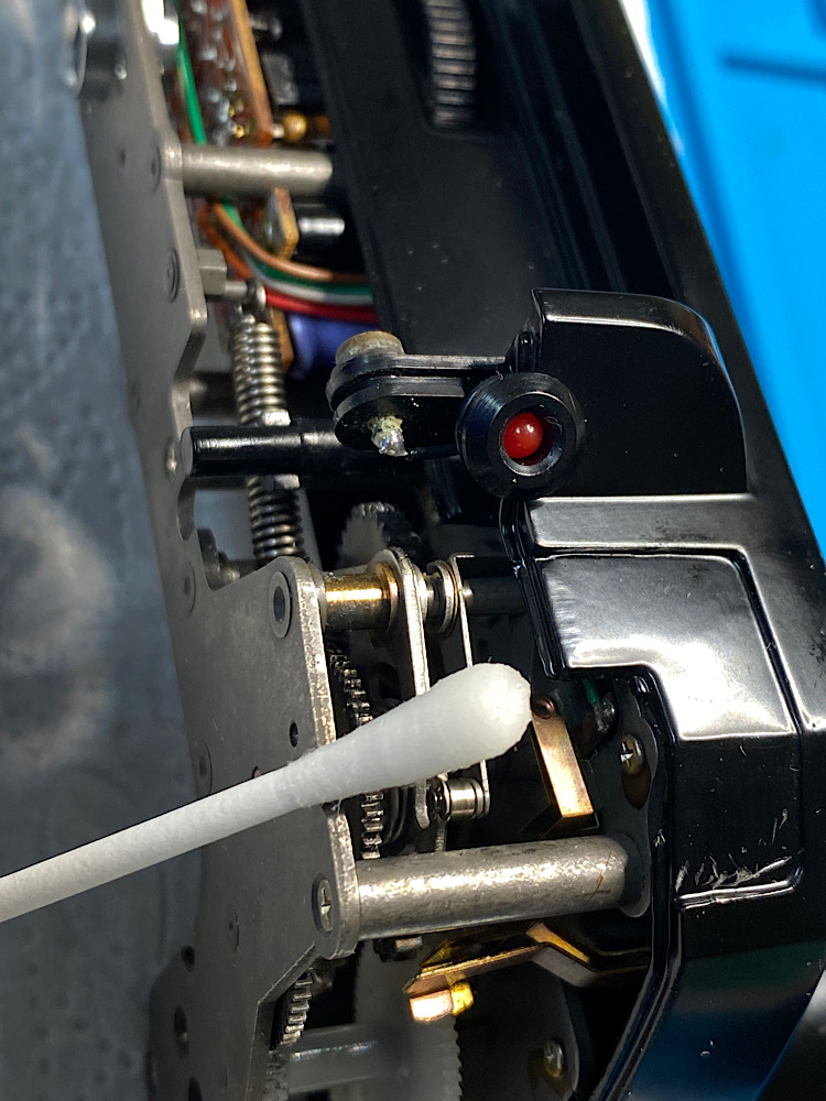 Die Zahnräder aus Kunststoff bekommen Ballistol-Silikonöl. Ebenso alle erreichbaren Achsen und Drehpunkte. Auch, wenn es durch den Verbau nicht viele sind..