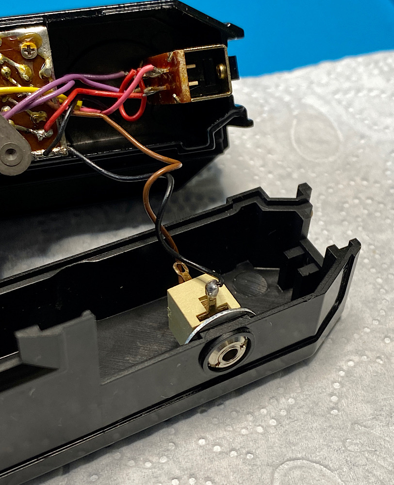 Nun ist der untere Gehäuseteil nur mehr über die Verkabelung der Buchse und eine Schraube am Betriebsmodusschalter verbunden.