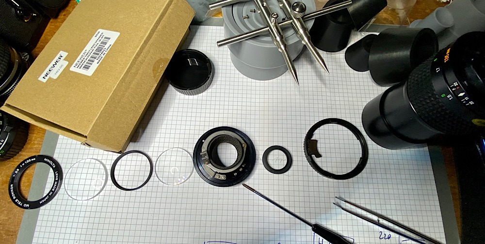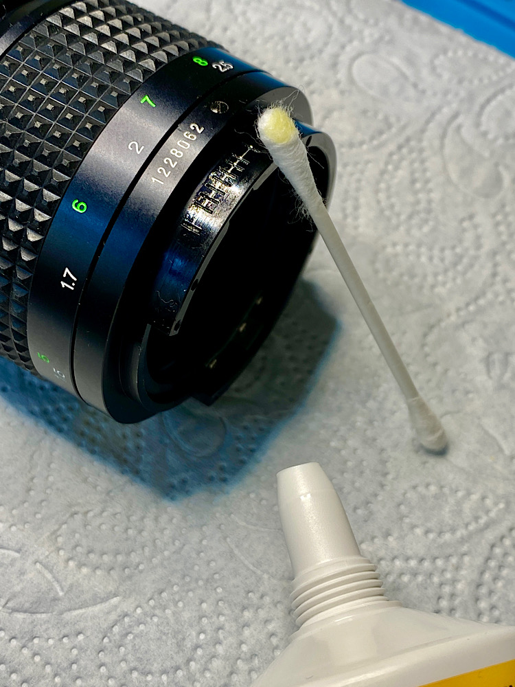 Auch die beiden vorderen Linsen reinige ich mit Wundbenzin auf Linsenreinigungspapier.