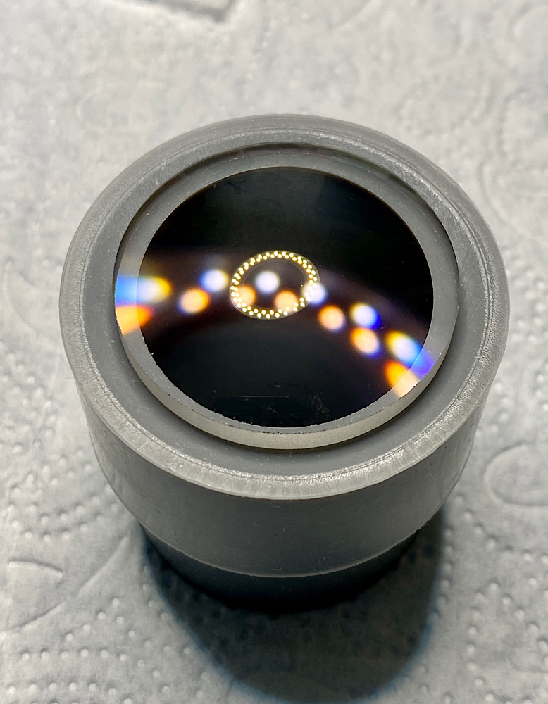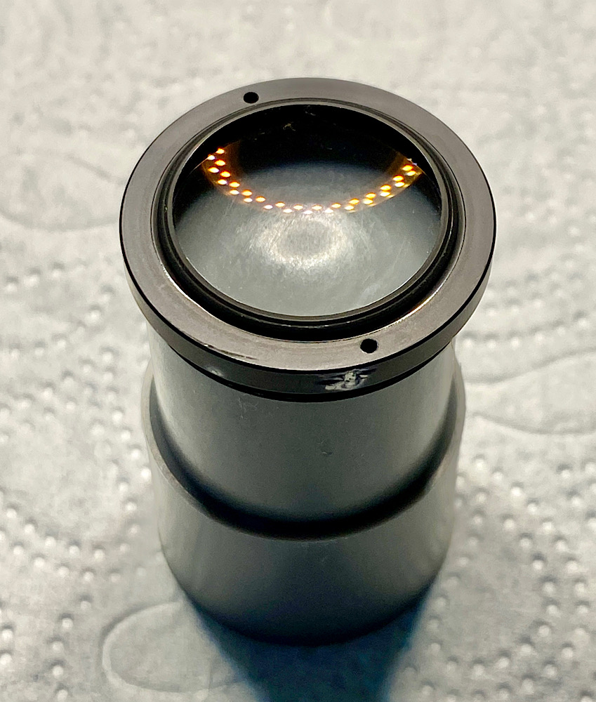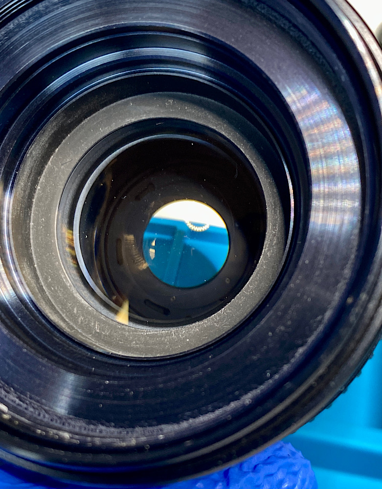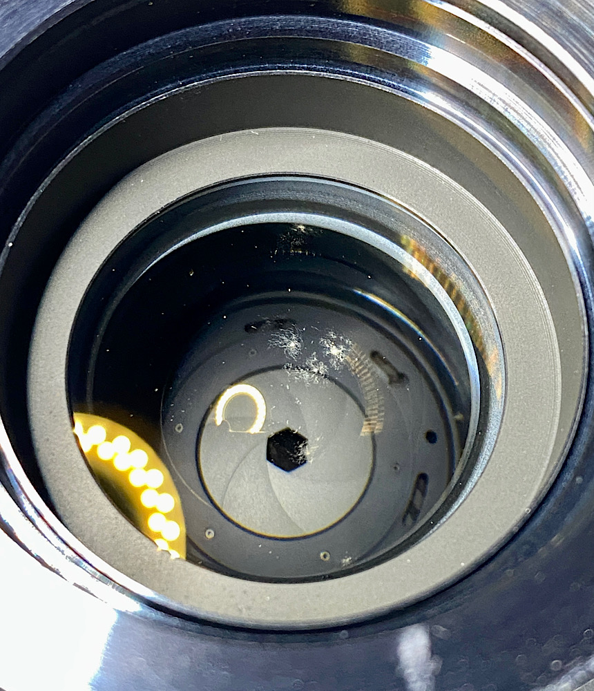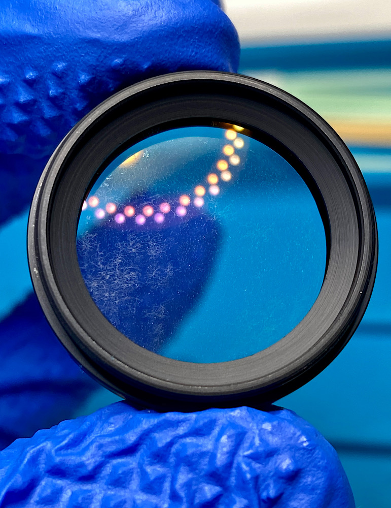 - Beim Check mit der LED-Lampe sind dann auch vereinzelt feinste Reinigungsspuren (Schlieren) erkennbar, die jedoch in hellem und diffusen Licht nicht sichtbar sind. Auch etwas Staub ist dazugekommen. Mit dem Linsenreinigungstuch von Zeiss hätte ich diese feinen Schlieren vielleicht entfernen können, aber ich möchte auf den inneren Linsen möglichst wenig arbeiten, da ihre Vergütung ggf. nicht so robust ist wie die der äußeren Linsen. Anstatt hier weiterzuputzen, finde ich mich damit ab, dass ich nicht im Reinraum maschinell arbeite ;-) Jedenfalls muss ich im LED-Licht schon sehr genau hinschauen, um diese Unregelmäßigkeiten zu finden. Teilweise reflektiert der Staub das Licht stärker. Für die Praxis völlig unbedeutend und bekommt hier nur Aufmerksamkeit, weil es Thema ist.