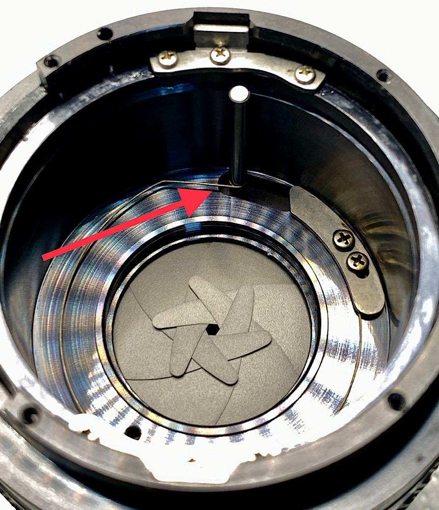 Damit die Blendenlamellen nicht unter Zug gehalten werden, hänge ich die zuständige Feder aus.