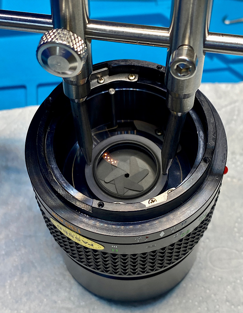 So sind beim Arbeiten an der Linse durch die Blendenöffnung die Blendenlamellen vor einer zuschnappenden „Blendenfalle“ geschützt, die sie verbiegen könnte.