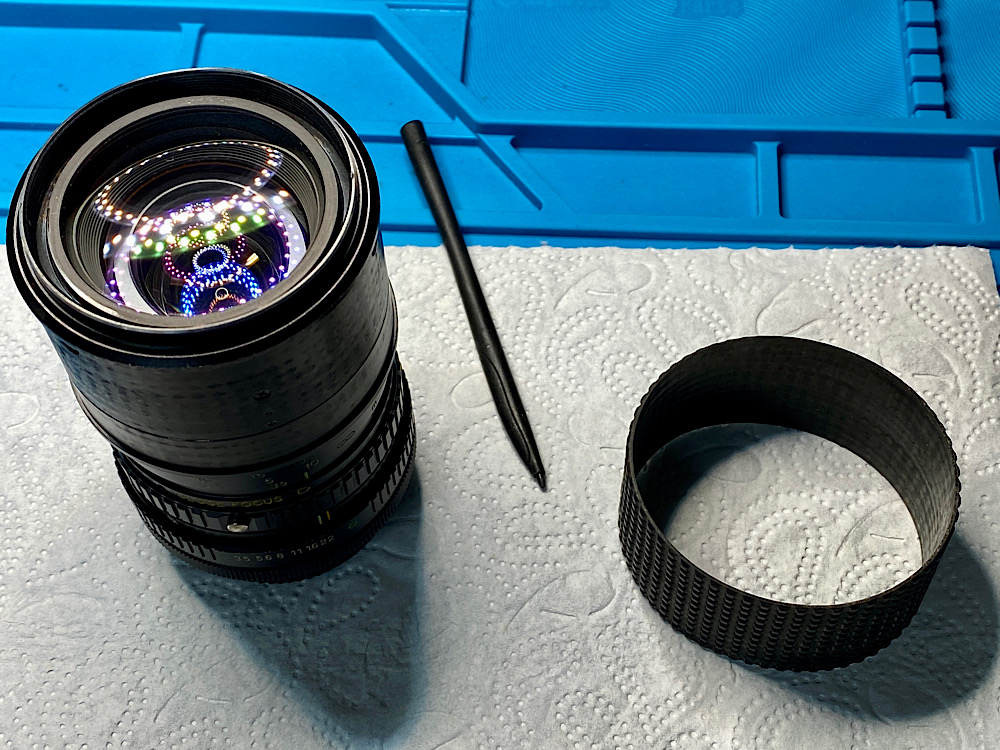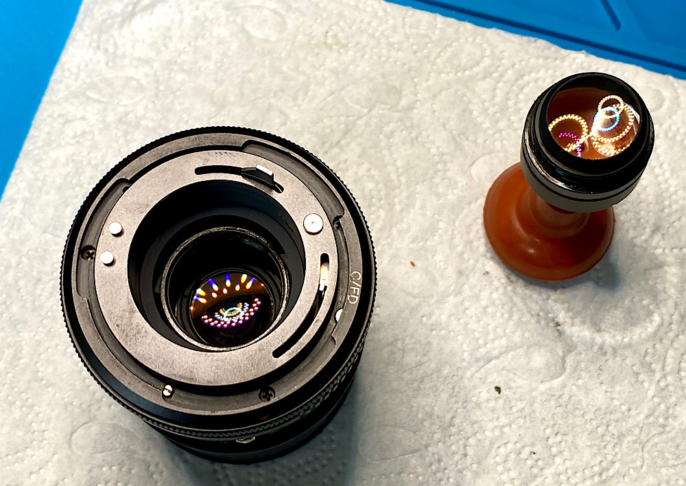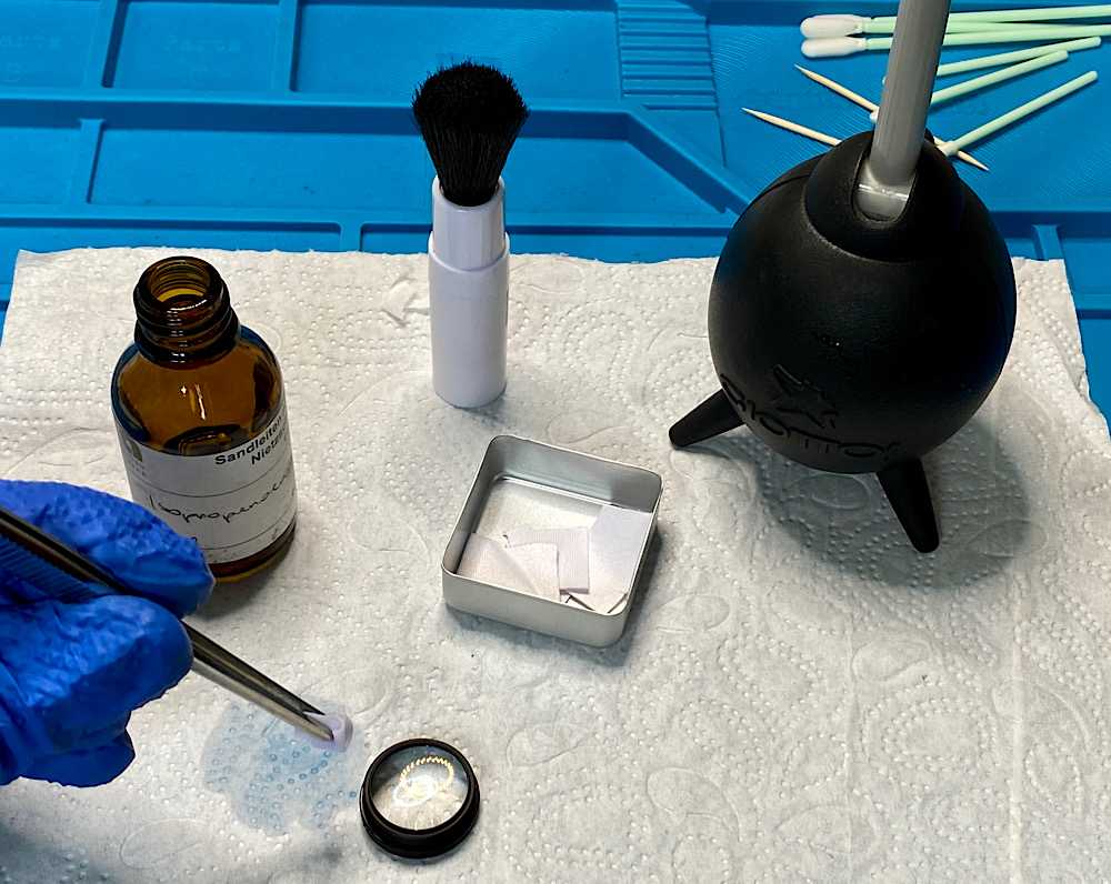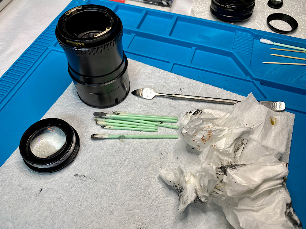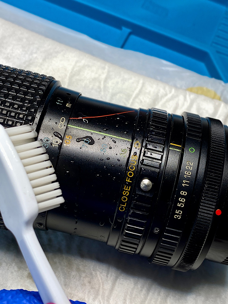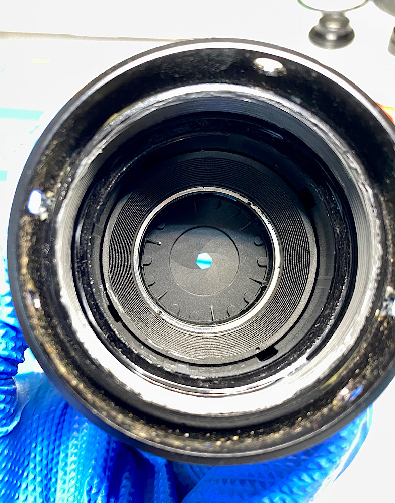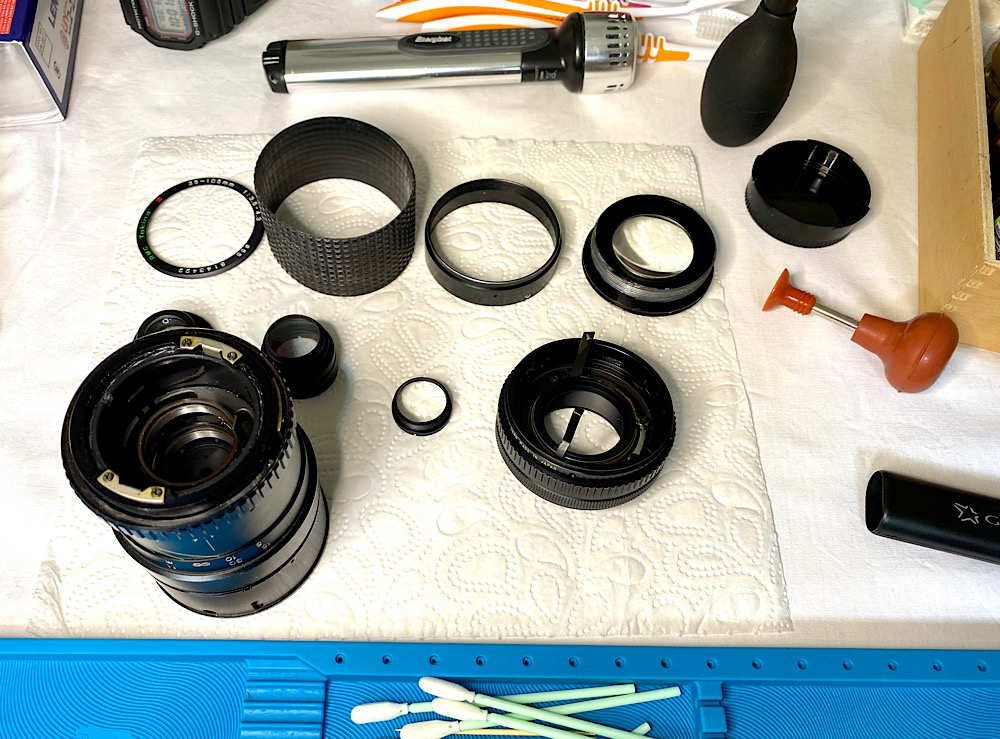 Ich spüle die Zoommechanik und die Blende in mehreren Durchgängen mit Sprit durch.