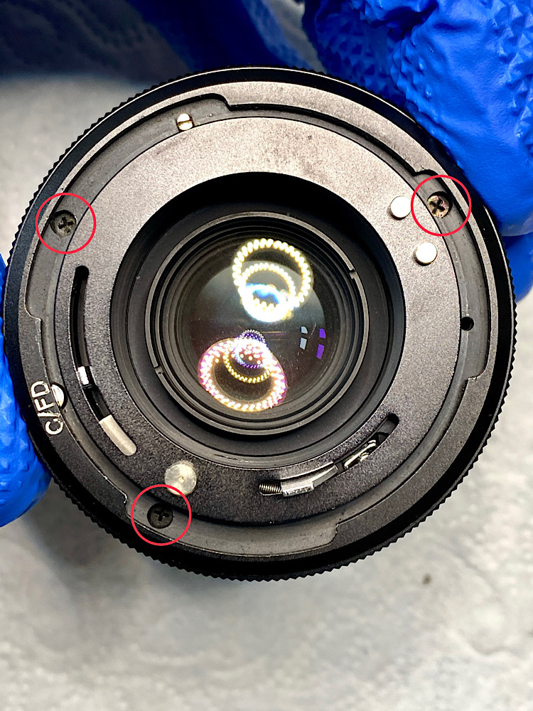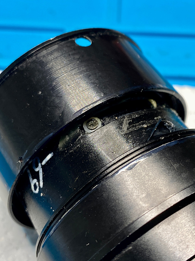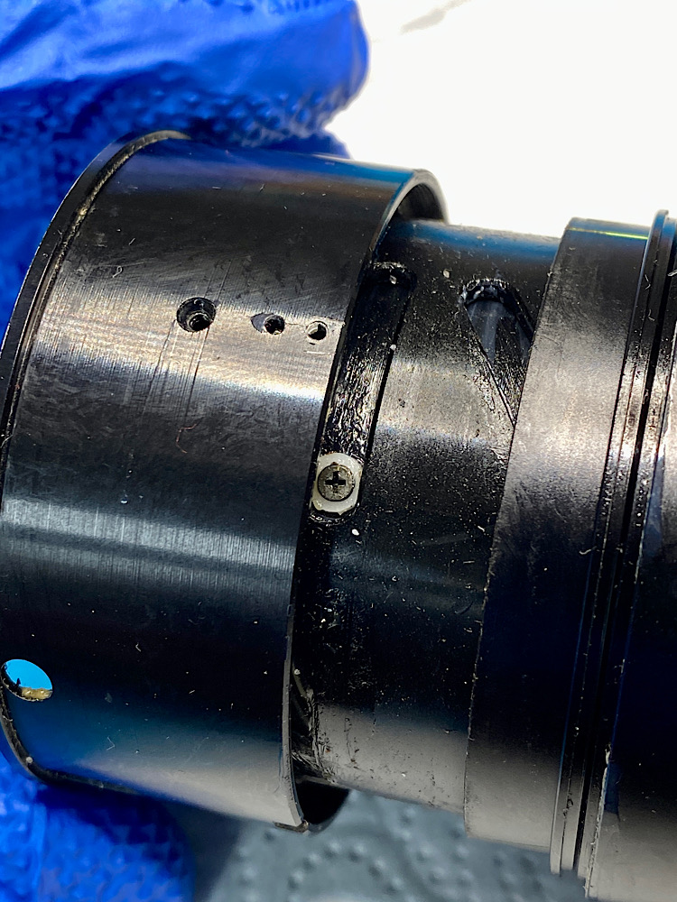 Die Kopplung des Fokusringes mit dem vorderen Helicoid zur Scharfstellung erfolgt über zwei Gleitlager und drei Schrauben.